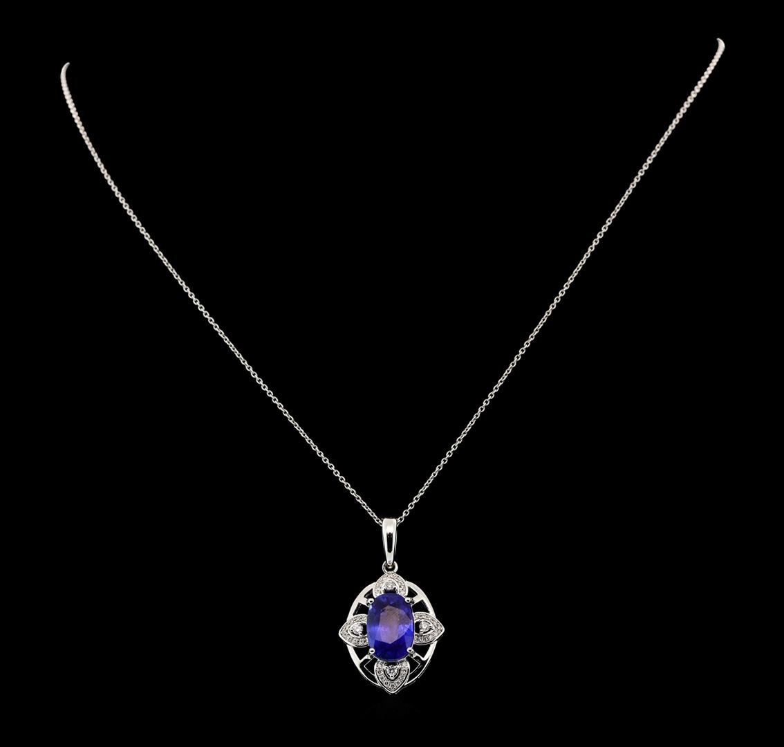 One electronically tested platinum ladies cast & assembled sapphire and diamond pendant with chain. The pendant features a sapphire set within a diamond accented frame, completed by a platinum bail. The pendant is supported by an eighteen inch length platinum designer style chain, terminating in a lobster claw clasp. Bright polish finish. Trademark is A. I. Identified with markings of "PT950". Condition is new, good workmanship. Containing: One prong set oval mixed cut natural blue sapphire, measuring 12.33 x 8.06 x 5.76mm, exact weight 5.40ct., clarity is slightly included, type II, medium dark, moderately strong, blue color, (GIA B 6/4), cut is good. Transmitting light with a minimum of distortion, transparent. Naturally occurring internal & external characteristics are present. No indications of heating. GIA Gemological Report attached. Graded loose prior to setting in the GIA Laboratory, Report #2234791031.Forty prong set round brilliant cut diamonds approximate total weight of 40 Stones = 0.23ct. Graded in the setting. Clarity: VS-1 to VS-2. Color: D - F. Total Weight of Colored Stones 5.40ct. Total Weight of Diamonds 0.23ct. Total Weight of Pendant With Chain 8.95gm. AIG Appraised.
