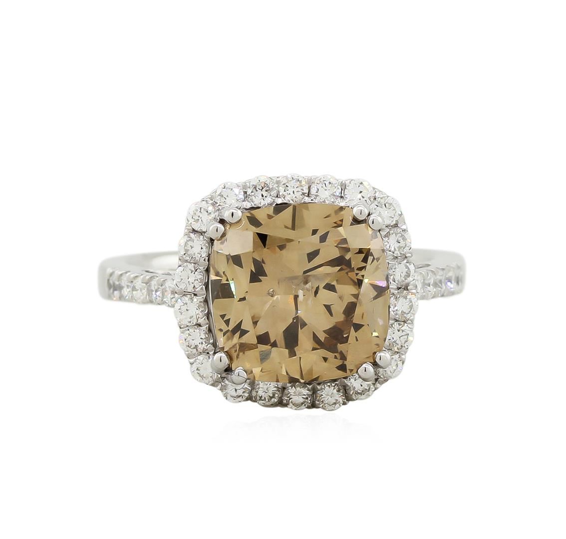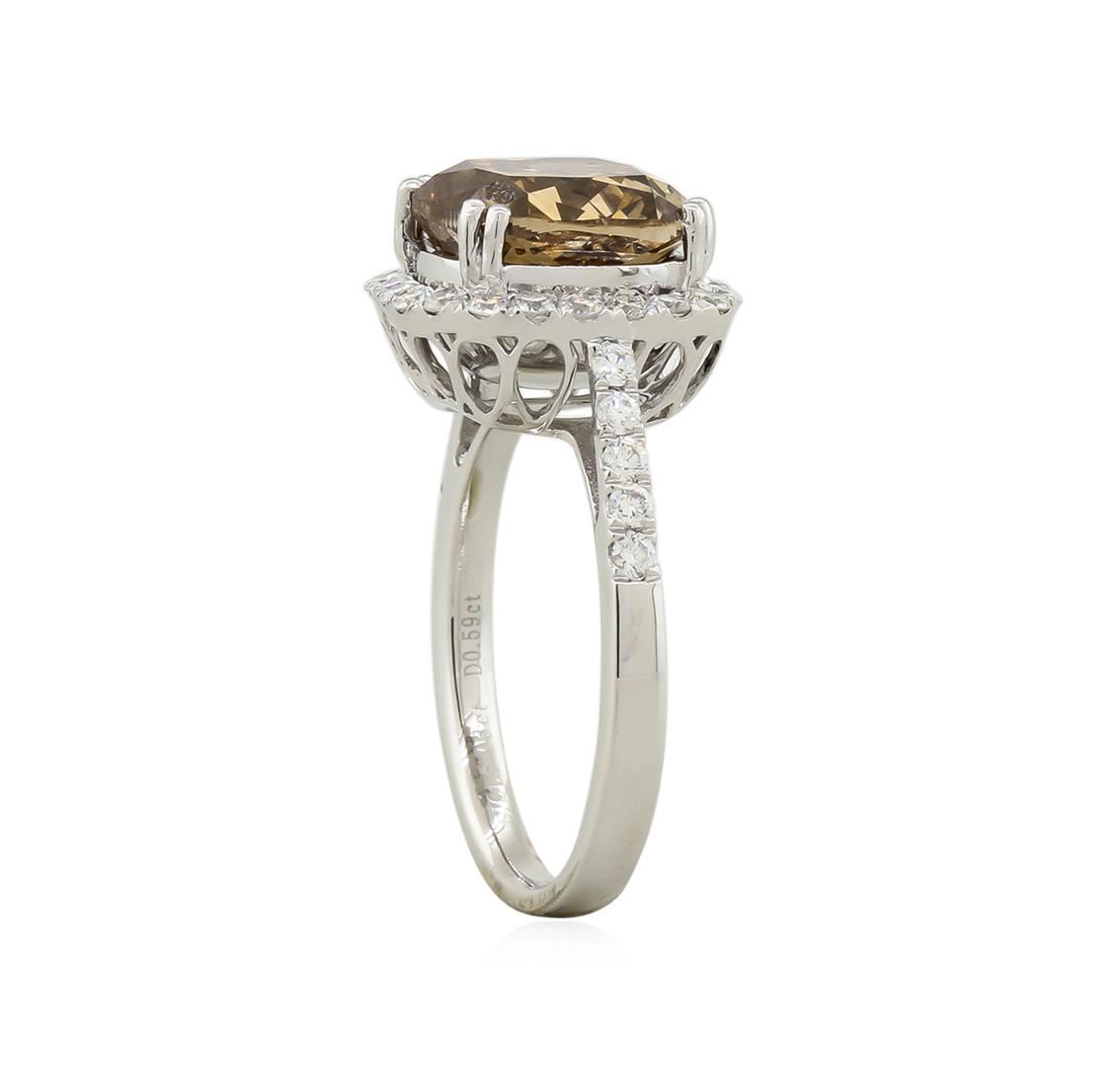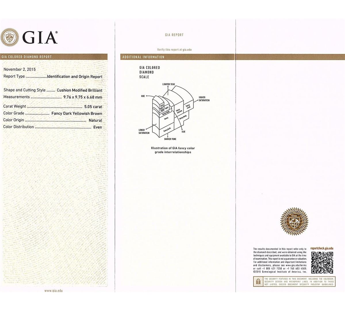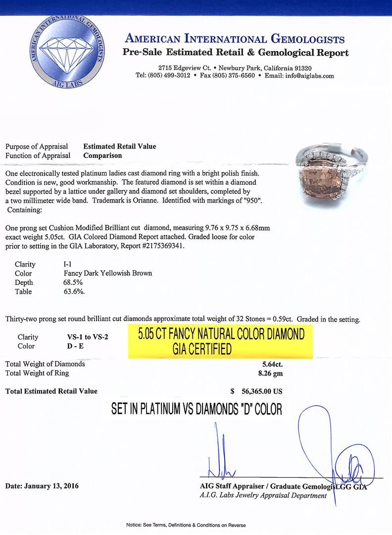 One electronically tested platinum ladies cast diamond ring with a bright polish finish. The featured diamond is set within a diamond bezel supported by a lattice under gallery and diamond set shoulders, completed by a two millimeter wide band. Trademark is Orianne. Identified with markings of "950". Condition is new, good workmanship. Containing: One prong set Cushion Modified Brilliant cut diamond, measuring 9.76 x 9.75 x 6.68mm exact weight 5.05ct. GIA Colored Diamond Report attached. Graded loose for color prior to setting in the GIA Laboratory, Report #2175369341. Clarity I-1. Color: Fancy Dark Yellowish Brown. Depth: 68.5%. Table: 63.6%. Thirty-Two prong set round brilliant cut diamonds approximate. Total Weight of 32 Stones = 0.59ct. Graded in the setting. Clarity: VS-1 to VS-2. Color: D - E. Total Weight of Diamonds 5.64ct. Total Weight of Ring 8.26gm. AIG Appraised at $56,365.00.