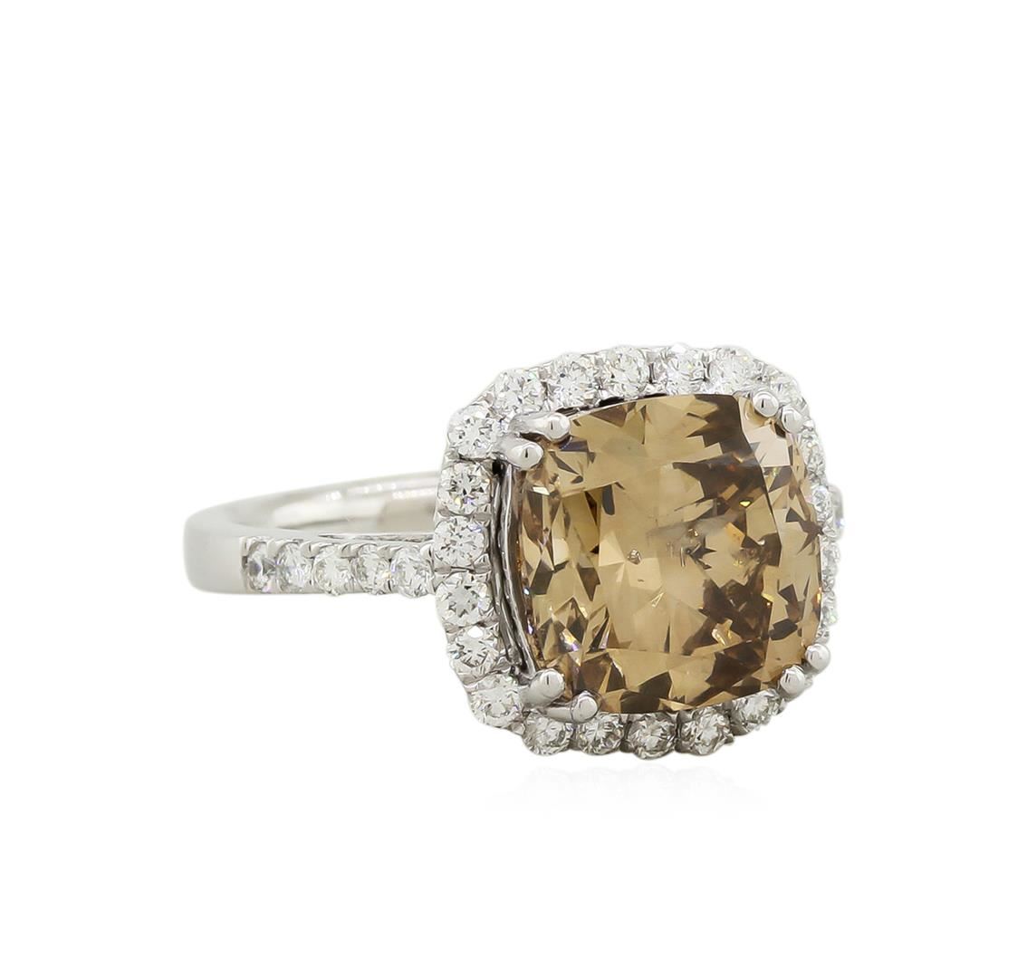 One electronically tested platinum ladies cast diamond ring with a bright polish finish. The featured diamond is set within a diamond bezel supported by a lattice under gallery and diamond set shoulders, completed by a two millimeter wide band. Trademark is Orianne. Identified with markings of "950". Condition is new, good workmanship. Containing: One prong set Cushion Modified Brilliant cut diamond, measuring 9.76 x 9.75 x 6.68mm exact weight 5.05ct. GIA Colored Diamond Report attached. Graded loose for color prior to setting in the GIA Laboratory, Report #2175369341. Clarity I-1. Color: Fancy Dark Yellowish Brown. Depth: 68.5%. Table: 63.6%. Thirty-Two prong set round brilliant cut diamonds approximate. Total Weight of 32 Stones = 0.59ct. Graded in the setting. Clarity: VS-1 to VS-2. Color: D - E. Total Weight of Diamonds 5.64ct. Total Weight of Ring 8.26gm. AIG Appraised at $56,365.00.