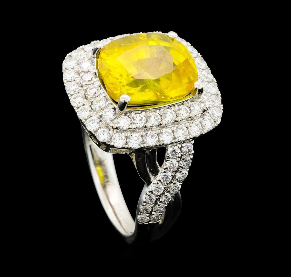 One electronically tested platinum ladies cast yellow sapphire and diamond ring with a bright polish finish. The featured yellow sapphire is set within a tiered diamond bezel supported by intertwining diamond set shoulders, completed by a two millimeter wide band. Trademark is Orianne. Identified with markings of "PT950". Condition is new, good workmanship. Containing: One prong set rectangular cushion mixed cut natural yellow sapphire, measuring 10.70 x 9.20 x 6.50mm, approximate weight of 5.96ct., clarity is slightly included, type II, medium dark, slightly brownish, yellow color, (GIA Y 6/2), cut is good. Transmitting light with a minimum of distortion, transparent. Naturally occurring internal & external characteristics are present. Colored Stone Grading Report attached. Graded in the setting.Seventy-Eight prong set round brilliant cut diamonds approximate total weight of 78 Stones = 1.09ct. Graded in the setting. Clarity: VS-1 to VS-2. Color: D - F. Total Weight of Colored Stones 5.96ct. Total Weight of Diamonds 1.09ct. Total Weight of Ring 8.68gm. AIG Appraised.