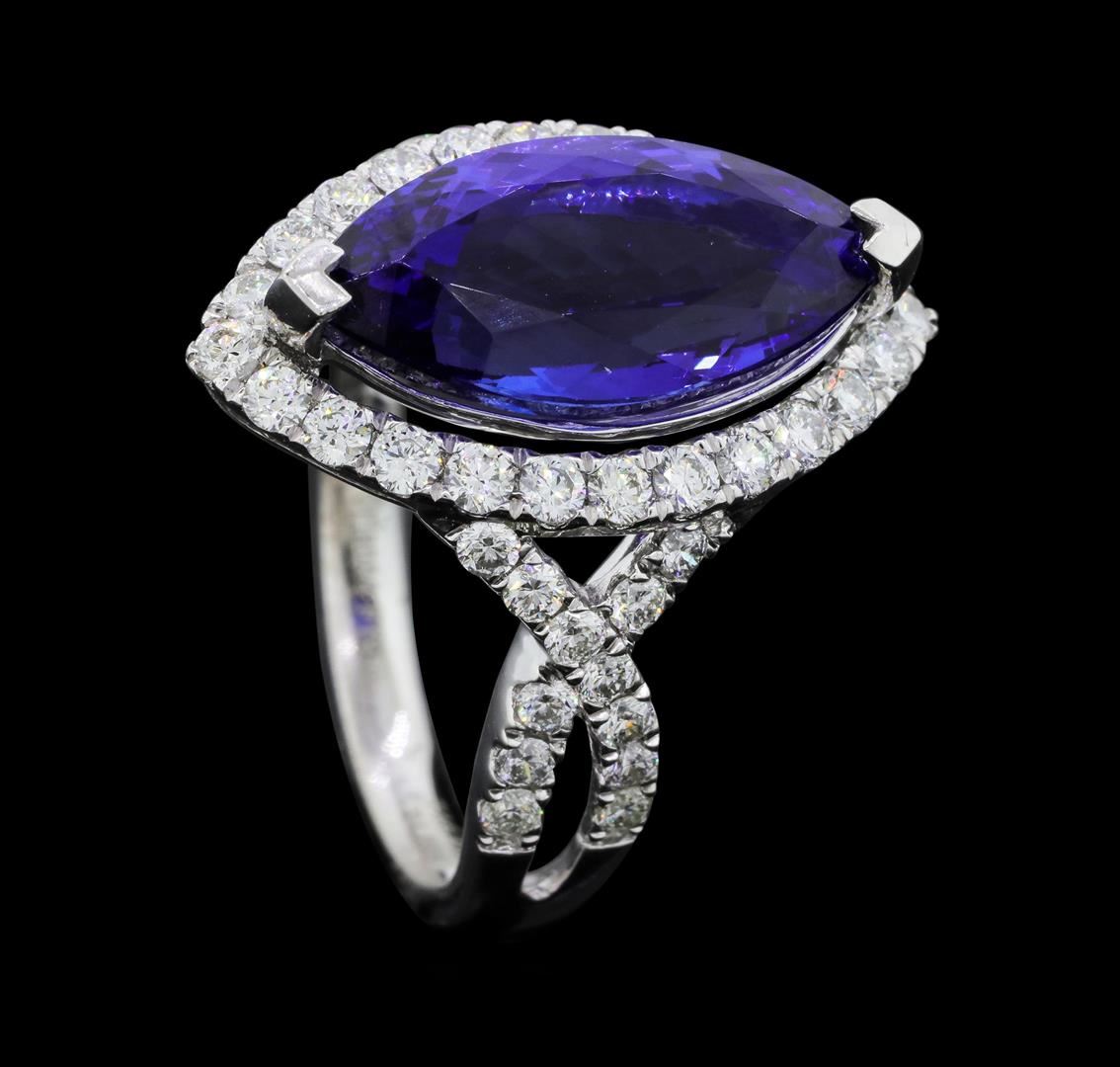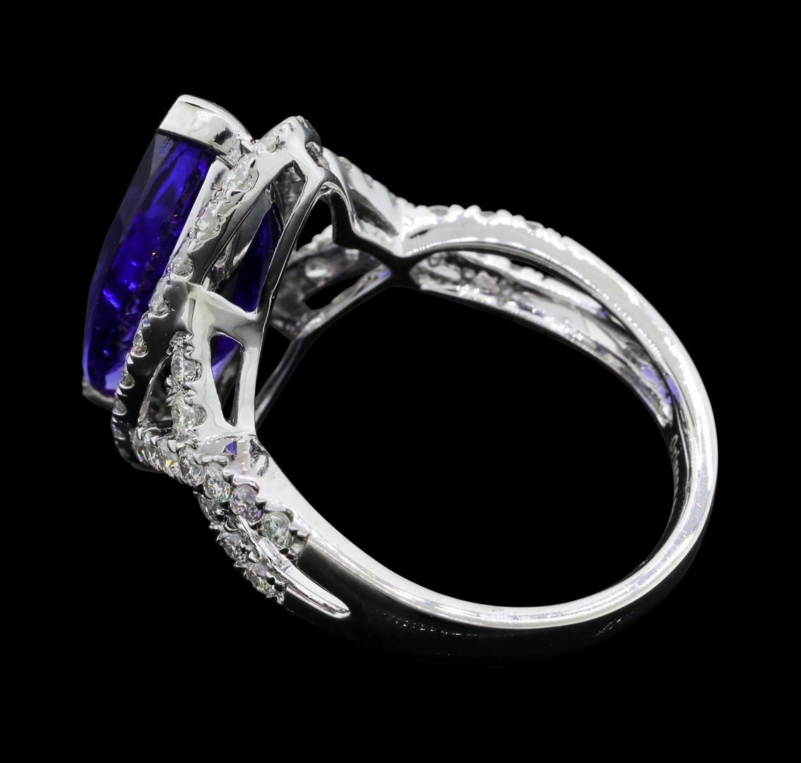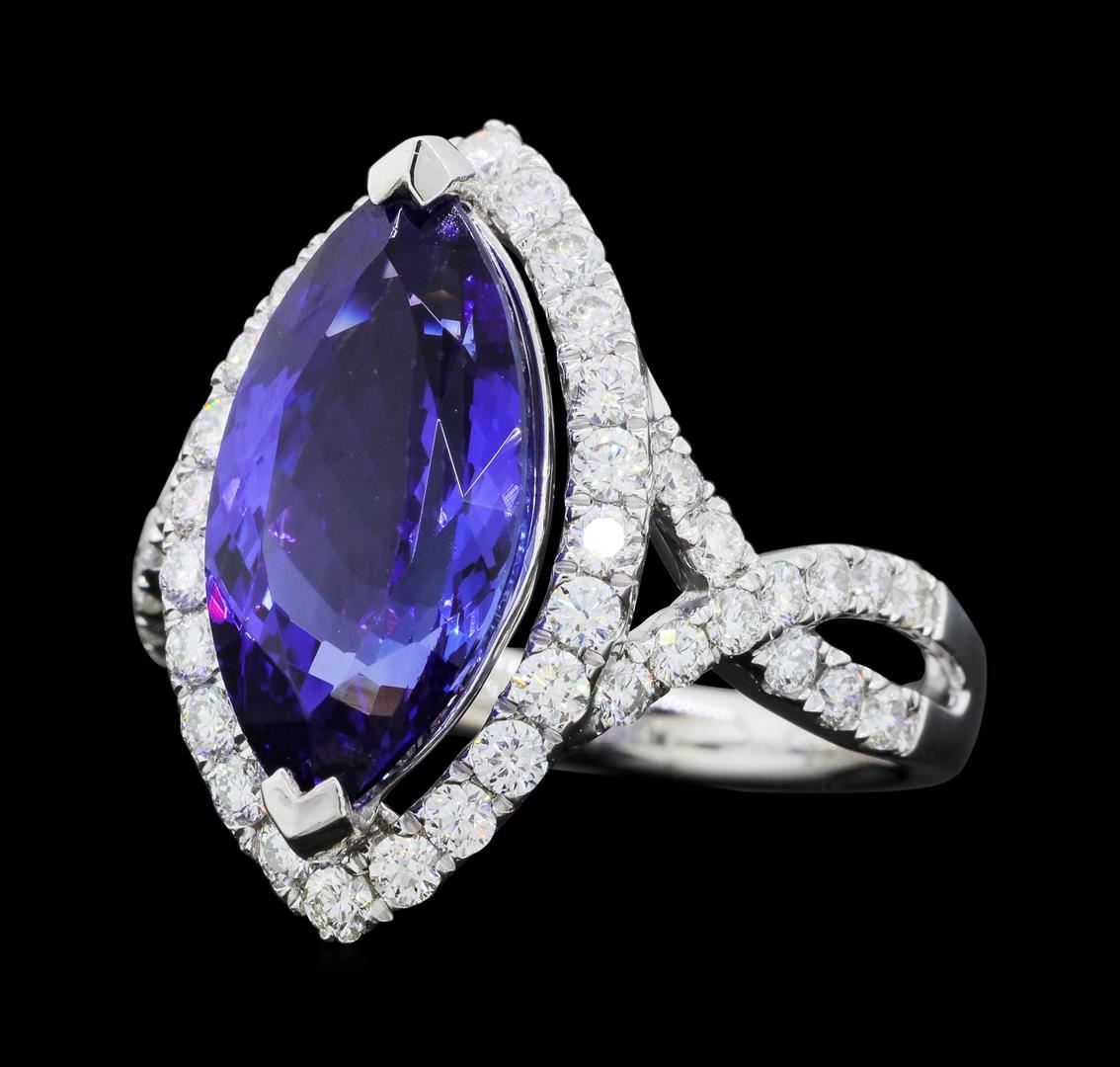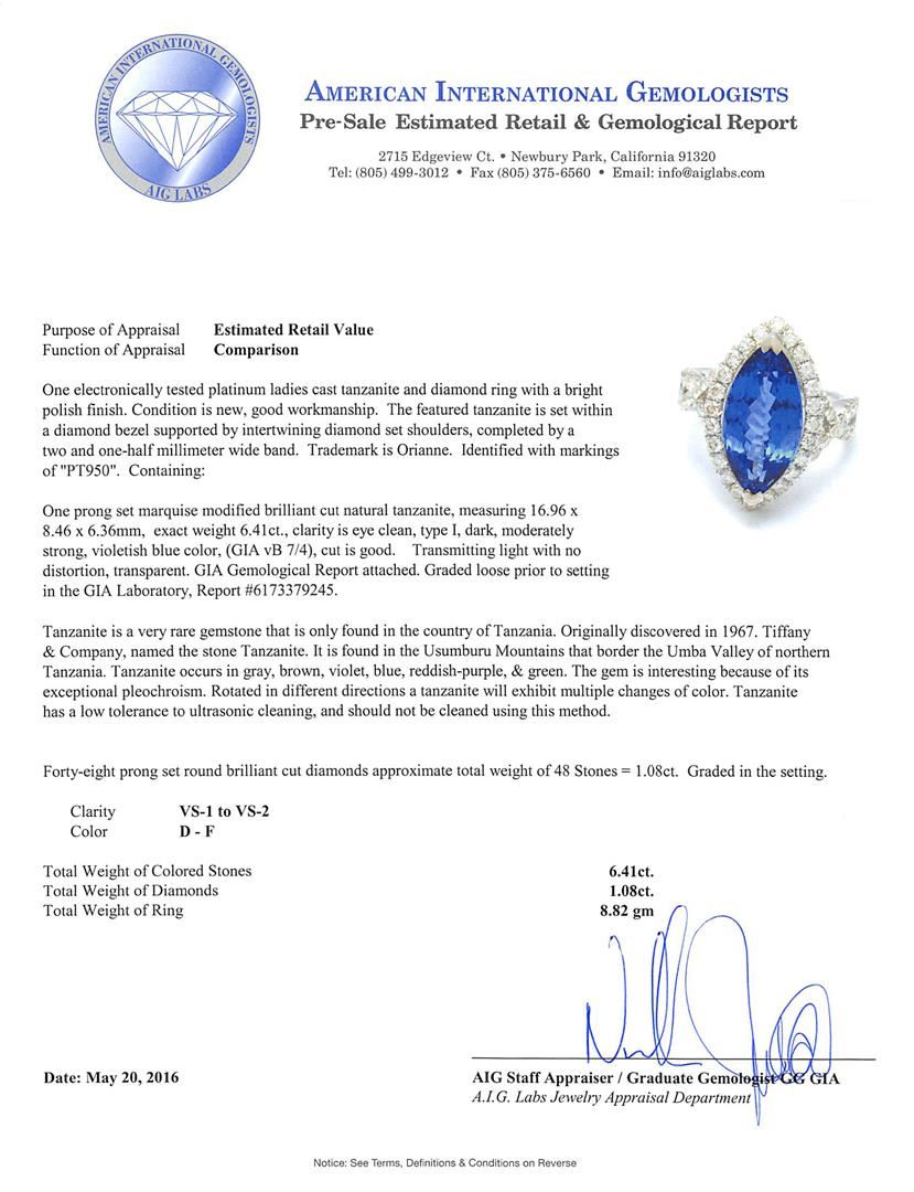 One electronically tested platinum ladies cast tanzanite and diamond ring with a bright polish finish. The featured tanzanite is set within a diamond bezel supported by intertwining diamond set shoulders, completed by a two and one-half millimeter wide band. Trademark is Orianne. Identified with markings of "PT950". Condition is new, good workmanship. Containing: One prong set marquise modified brilliant cut natural tanzanite, measuring 16.96 x 8.46 x 6.36mm, exact weight 6.41ct., clarity is eye clean, type I, dark, moderately strong, violetish blue color, (GIA vB 7/4), cut is good. Transmitting light with no distortion, transparent. GIA Gemological Report attached. Graded loose prior to setting in the GIA Laboratory, Report #6173379245.Tanzanite is a very rare gemstone that is only found in the country of Tanzania. Originally discovered in 1967. Tiffany & Company, named the stone Tanzanite. It is found in the Usumburu Mountains that border the Umba Valley of northern Tanzania. Tanzanite occurs in gray, brown, violet, blue, reddish-purple, & green. The gem is interesting because of its exceptional pleochroism. Rotated in different directions a tanzanite will exhibit multiple changes of color. Tanzanite has a low tolerance to ultrasonic cleaning, and should not be cleaned using this method. Forty-Eight prong set round brilliant cut diamonds approximate total weight of 48 Stones = 1.08ct. Graded in the setting. Clarity: VS-1 to VS-2. Color: D - F. Total Weight of Colored Stones 6.41ct. Total Weight of Diamonds 1.08ct. Total Weight of Ring 8.82gm. AIG Appraised.