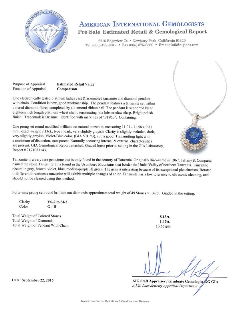 One electronically tested platinum ladies cast & assembled tanzanite and diamond pendant with chain. The pendant features a tanzanite set within a tiered diamond floret, completed by a diamond ribbon bail. The pendant is supported by an eighteen inch length platinum wheat chain, terminating in a lobster claw clasp. Bright polish finish. Trademark is Orianne. Identified with markings of "PT950". Condition is new, good workmanship. Containing: One prong set round modified brilliant cut natural tanzanite, measuring 11.07 - 11.58 x 9.81 mm, exact weight 8.13ct., type I, dark, very slightly grayish Clarity is slightly included, dark, very slightly grayish, Violet-Blue color, (GIA VB 7/3), cut is good. Transmitting light with a minimum of distortion, transparent. Naturally occurring internal & external characteristics are present. GIA Gemological Report attached. Graded loose prior to setting in the GIA Laboratory, Report # 2171083143.Tanzanite is a very rare gemstone that is only found in the country of Tanzania. Originally discovered in 1967. Tiffany & Company, named the stone Tanzanite. It is found in the Usumburu Mountains that border the Umba Valley of northern Tanzania. Tanzanite occurs in gray, brown, violet, blue, reddish-purple, & green. The gem is interesting because of its exceptional pleochroism. Rotated in different directions a tanzanite will exhibit multiple changes of color. Tanzanite has a low tolerance to ultrasonic cleaning, and should not be cleaned using this method. Forty-Nine prong set round brilliant cut diamonds approximate total weight of 49 Stones = 1.47ct. Graded in the setting. Clarity: VS-2 to SI-2. Color: G - H. Total Weight of Colored Stones 8.13ct. Total Weight of Diamonds 1.47ct. Total Weight of Pendant With Chain 13.65gm. AIG Appraised.
