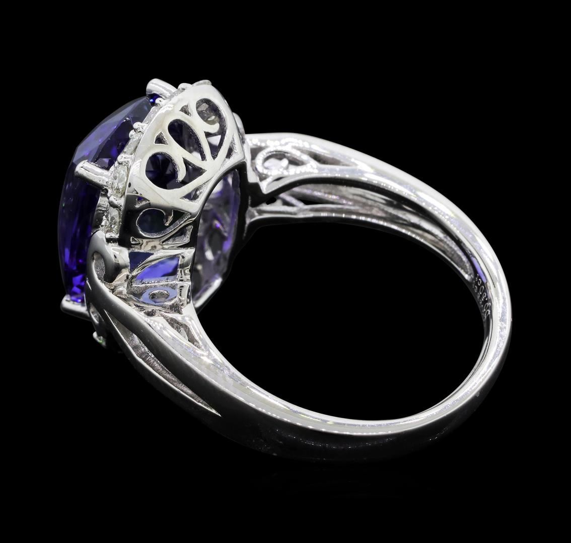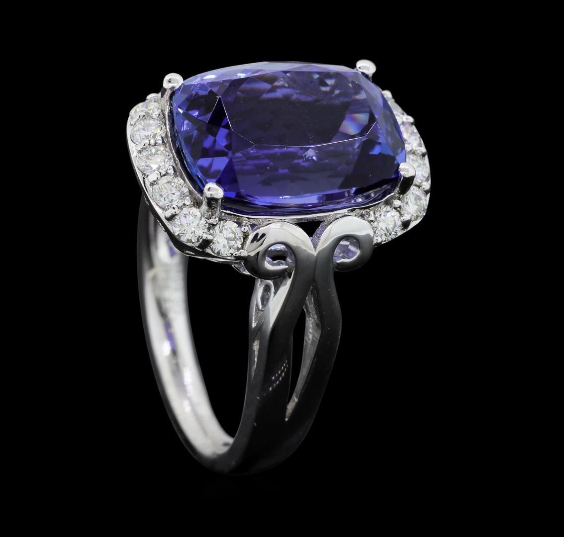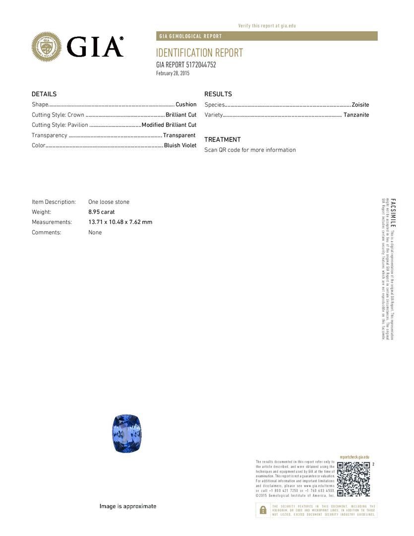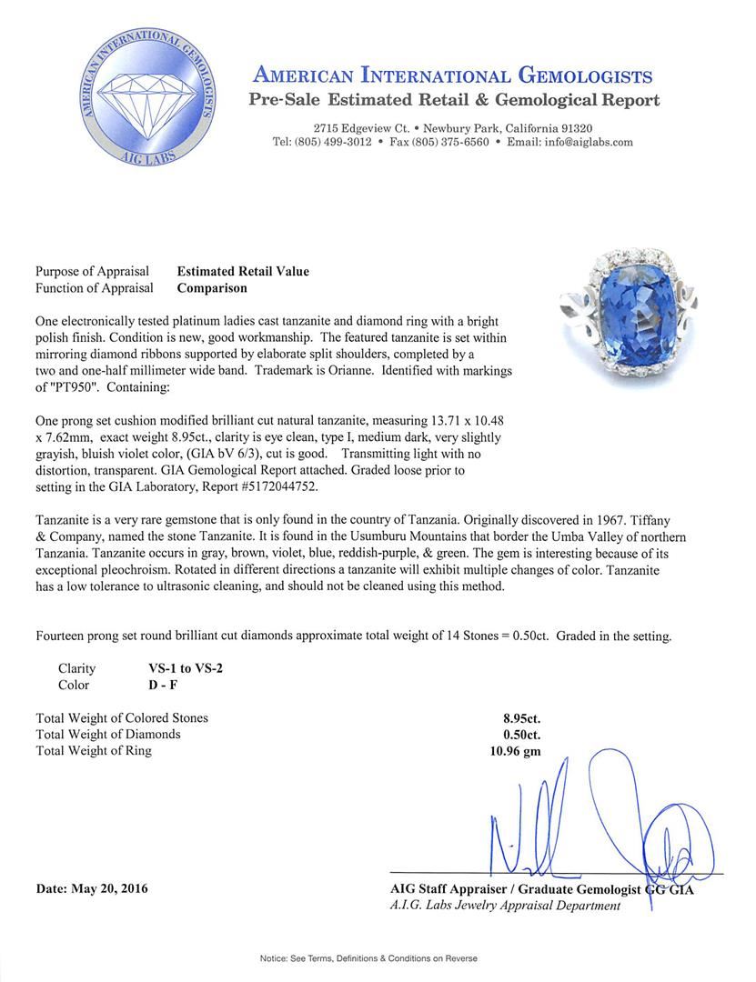 One electronically tested platinum ladies cast tanzanite and diamond ring with a bright polish finish. The featured tanzanite is set within mirroring diamond ribbons supported by elaborate split shoulders, completed by a two and one-half millimeter wide band. Trademark is Orianne. Identified with markings of "PT950". Condition is new, good workmanship. Containing: One prong set cushion modified brilliant cut natural tanzanite, measuring 13.71 x 10.48 x 7.62mm, exact weight 8.95ct., clarity is eye clean, type I, medium dark, very slightly grayish, bluish violet color, (GIA bV 6/3), cut is good. Transmitting light with no distortion, transparent. GIA Gemological Report attached. Graded loose prior topsetting in the GIA Laboratory, Report #5172044752.Tanzanite is a very rare gemstone that is only found in the country of Tanzania. Originally discovered in 1967. Tiffany & Company, named the stone Tanzanite. It is found in the Usumburu Mountains that border the Umba Valley of northern Tanzania. Tanzanite occurs in gray, brown, violet, blue, reddish-purple, & green. The gem is interesting because of its exceptional pleochroism. Rotated in different directions a tanzanite will exhibit multiple changes of color. Tanzanite has a low tolerance to ultrasonic cleaning, and should not be cleaned using this method. Fourteen prong set round brilliant cut diamonds approximate total weight of 14 Stones = 0.50ct. Graded in the setting. Clarity: VS-1 to VS-2. Color: D - F. Total Weight of Colored Stones 8.95ct. Total Weight of Diamonds 0.50ct. Total Weight of Ring 10.96gm. AIG Appraised.