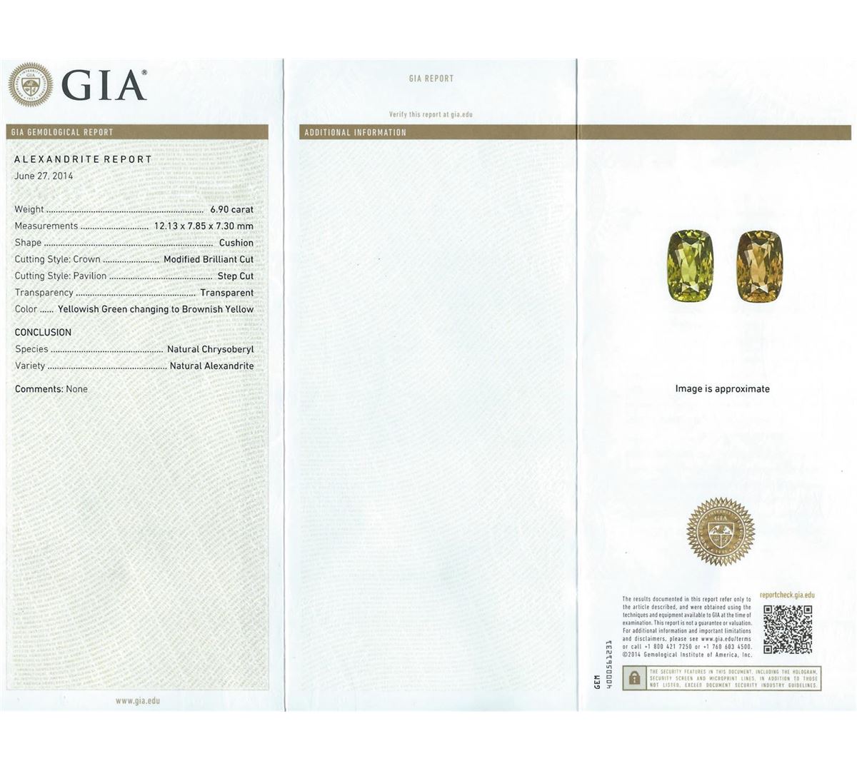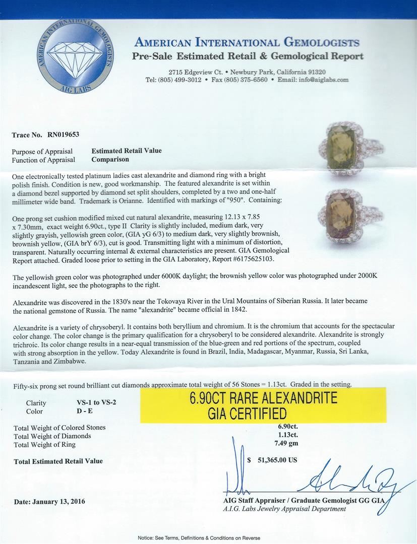 One electronically tested platinum ladies cast alexandrite and diamond ring with a bright polish finish. The featured alexandrite is set within a diamond bezel supported by diamond set split shoulders, completed by a two and one-half millimeter wide band. Trademark is Orianne. Identified with markings of "950". Condition is new, good workmanship. Containing: One prong set cushion modified mixed cut natural alexandrite, measuring 12.13 x 7.85 x 7.30mm, exact weight 6.90ct., type II Clarity is slightly included, medium dark, very slightly grayish, yellowish green color, (GIA yG 6/3) to medium dark, very slightly brownish, brownish yellow, (GIA brY 6/3), cut is good. Transmitting light with a minimum of distortion, transparent. Naturally occurring internal & external characteristics are present. GIA Gemological Report attached. Graded loose prior to setting in the GIA Laboratory, Report #6175625103.The yellowish green color was photographed under 6000K daylight; the brownish yellow color was photographed under 2000K incandescent light, see the photographs to the right.Alexandrite was discovered in the 1830's near the Tokovaya River in the Ural Mountains of Siberian Russia. It later became the national gemstone of Russia. The name "alexandrite" became official in 1842.Alexandrite is a variety of chrysoberyl. It contains both beryllium and chromium. It is the chromium that accounts for the spectacular color change. The color change is the primary qualification for a chrysoberyl to be considered alexandrite. Alexandrite is strongly trichroic. Its color change results in a near-equal transmission of the blue-green and red portions of the spectrum, coupled with strong absorption in the yellow. Today Alexandrite is found in Brazil, India, Madagascar, Myanmar, Russia, Sri Lanka, Tanzania and Zimbabwe.Fifty-Six prong set round brilliant cut diamonds approximate. Total Weight of 56 Stones = 1.13ct. Graded in the setting. Clarity: VS-1 to VS-2. Color: D - E. Total Weight of Colored Stones 6.90ct. Total Weight of Diamonds 1.13ct. Total Weight of Ring 7.49gm. AIG Appraised at $51,365.00.