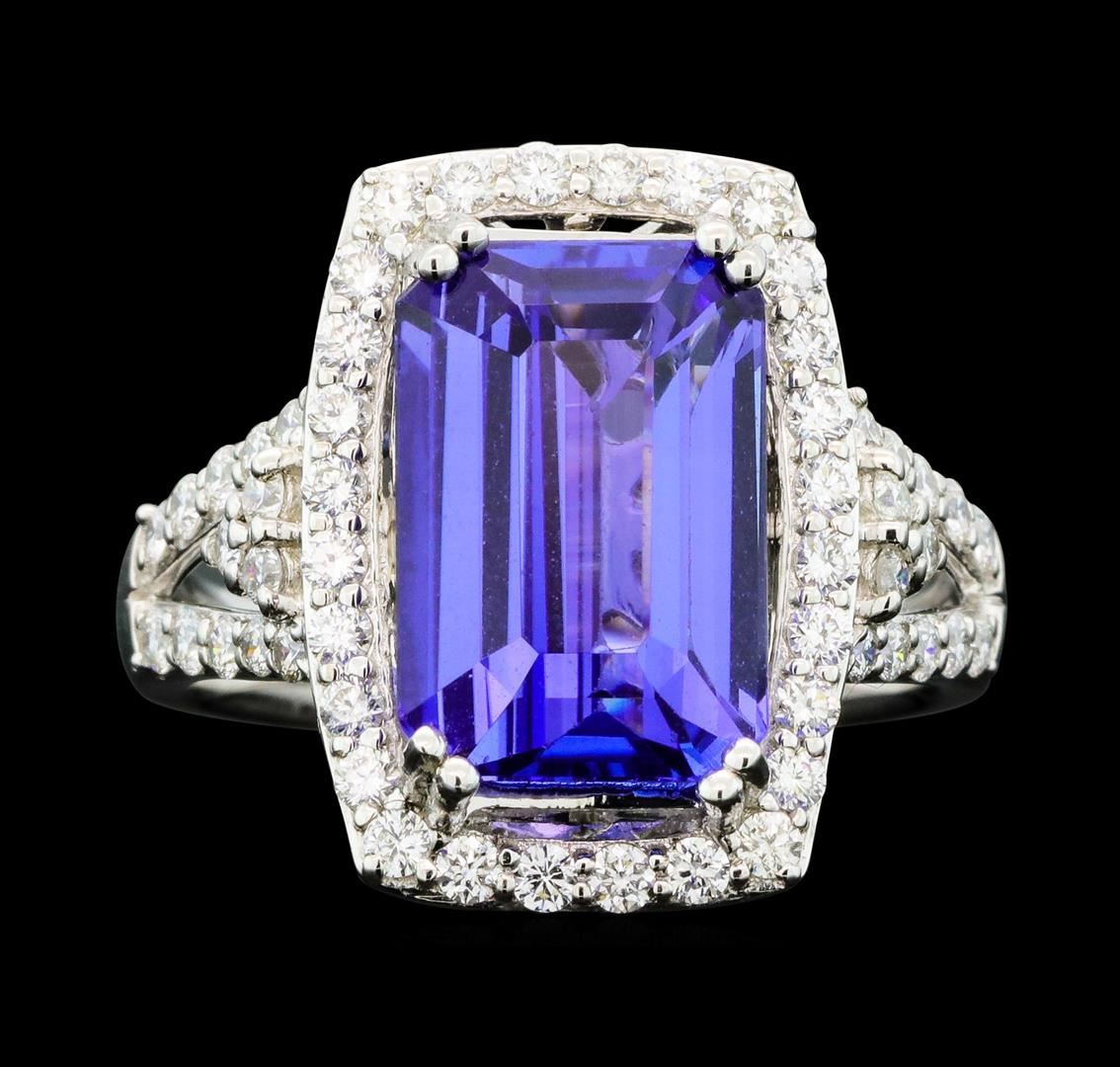 One electronically tested platinum ladies cast tanzanite and diamond ring with a bright polish finish. The featured tanzanite is set within a diamond bezel supported by an elaborate lattice under gallery and diamond set split shoulders, completed by a two and one-half millimeter wide band. Trademark is Orianne. Identified with markings of "PT950". Condition is new, good workmanship. Containing: One prong set octagonal step cut natural tanzanite, measuring 12.76 x 8.74 x 6.15mm, exact weight 6.26ct., clarity is eye clean, type I, medium dark, moderately strong, violetish blue color, (GIA vB 6/4), cut is good. Transmitting light with no distortion, transparent. GIA Colored Stone Grading Report attached. Graded loose prior to setting in the GIA Laboratory, Report # 6173379223.Tanzanite is a very rare gemstone that is only found in the country of Tanzania. Originally discovered in 1967. Tiffany & Company, named the stone Tanzanite. It is found in the Usumburu Mountains that border the Umba Valley of northern Tanzania. Tanzanite occurs in gray, brown, violet, blue, reddish-purple, & green. The gem is interesting because of its exceptional pleochroism. Rotated in different directions a tanzanite will exhibit multiple changes of color. Tanzanite has a low tolerance to ultrasonic cleaning, and should not be cleaned using this method. Fifty-Four prong set round brilliant cut diamonds approximate total weight of 54 Stones = 0.82ct. Graded in the setting. Clarity: VS-2 to SI-1. Color: D - F. Total Weight of Colored Stones 6.26ct. Total Weight of Diamonds 0.82ct. Total Weight of Ring 9.70gm. AIG Appraised.