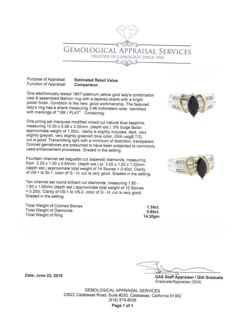 One electronically tested 18KT-platinum yellow gold lady's combination cast & assembled fashion ring with a tapered shank with a bright polish finish. The featured lady's ring has a shank measuring 3.46 millimeters wide. Identified with markings of '18K / PLAT'. Condition is like new, good workmanship. Containing: One prong set marquise modified mixed cut natural blue sapphire, measuring 10.00 x 5.08 x 3.30mm, (depth est.) 5%. bulge factor, approximate weight of 1.35ct., clarity is slightly included, dark, very slightly grayish, very slightly greenish blue color, (GIA vslgB 7/3), cut is good. Transmitting light with a minimum of distortion, transparent. Colored gemstones are presumed to have been subjected to commonly used enhancement processes. Graded in the setting. Fourteen channel set baguette cut (tapered) diamonds, measuring from 2.25 x 1.00 x 0.85mm (depth est.) to 3.50 x 1.20 x 1.02mm (depth est.) approximate total weight of 14 Stones = 0.40ct. Graded in the setting. Color G - H Clarity VS-1 to SI-1 Cut Very Good Ten channel set round brilliant cut diamonds, measuring 1.80 - 1.60 x 1.05mm (depth est.) approximate total weight of 10 Stones = 0.20ct. Graded in the setting. Color G - H Clarity VS-1 to VS-2 Cut Very Good. Total Weight of Colored Stones 1.35ct. Total Weight of Diamonds 0.60ct. Total Weight of Ring 14.30gm. GAS Appraised.