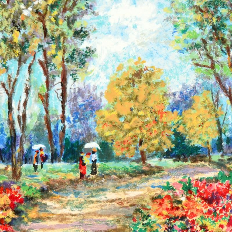 "In the Park" is a limited edition serigraph on paper, numbered and hand signed by Dimitri Polak (1922-2008). Includes Certificate of Authenticity. Measures approx. 16.5" x 13.5" (border), 15" x 12" (image).