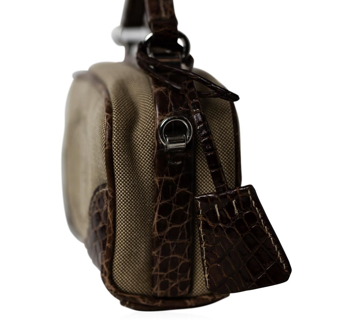 This authentic mini Prada bag is perfect for a night on the town. It features brown jacquard material with "Prada Milano" inside their iconic rope design front and center. Framing the bag in it's entirety is beautiful shiny brown leather with an exotic look and feel. The interior is lined in supple tan leather and features a zippered pocket. This mini fashion must-have can be hand-held via the leather top strap or worn on the shoulder/crossbody via the included matching leather strap. Finishing off the bag is silver-tone hardware, a lock pochette and lock. Complete with authenticity card and drawstring dust bag. Good used condition with some signs of wear on corners and only minor scratches or stains. Please see pictures. Approximate dimensions: 6.5" x 4" x 2.5"