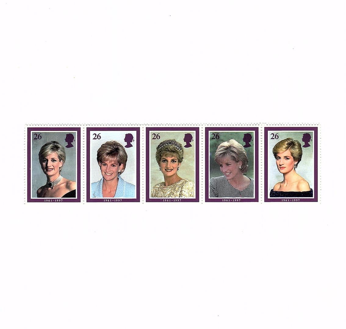 Strip of 5 Princess Diana 26-pence stamps along with International Collectors' Society Certificate of Authenticity. Never used, with plastic protective sleeve.