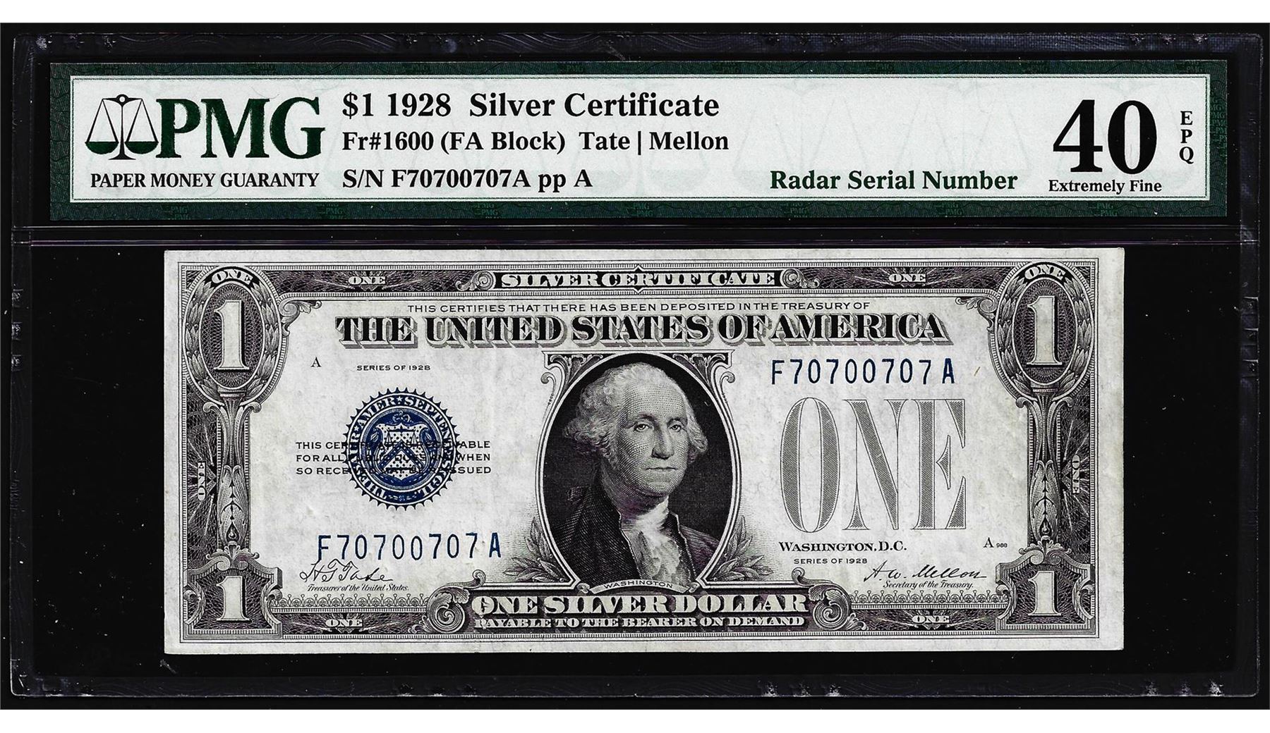 One Radar Serial Number 1928 $1 Funnyback Silver Certificate Note PMG Extremely Fine 40EPQ. PMG Certified.