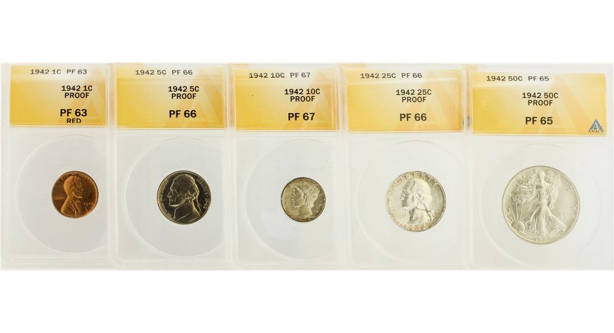 This 1942 ANACS Graded (5) Coin Proof Set includes the following coins: 1942 Lincoln Cent ANACS Graded PR63RD coin, 1942 Jefferson Nickel ANACS Graded PF66, 1942 Mercury Dime ANACS Graded PR67, 1942 Washington Quarter ANACS Graded PR66, 1942 Liberty Walking Half Dollar ANACS Graded PR65. These are very sought after coins and is a great addition to any collection. ANACS Certified.