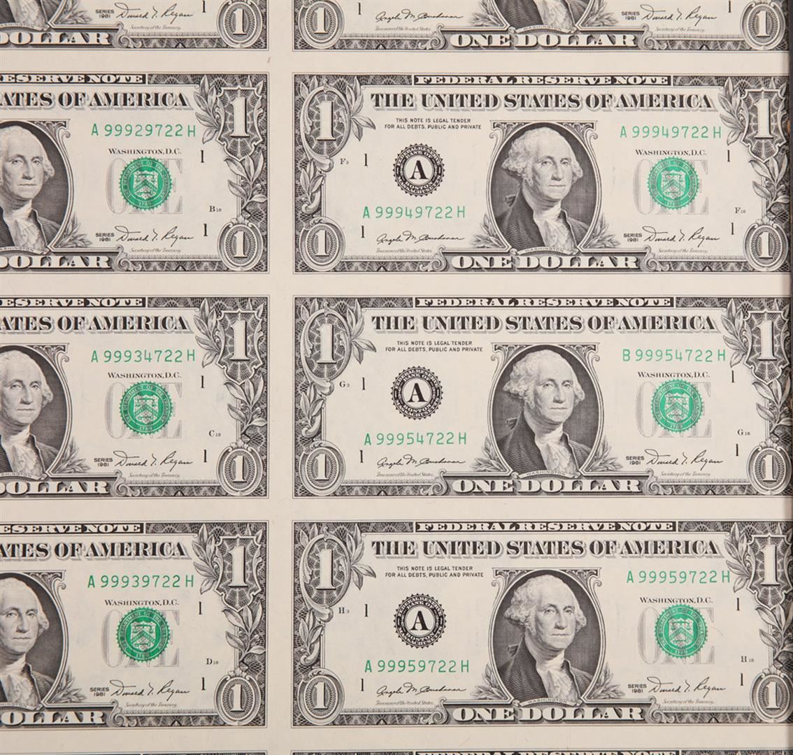 One Rare 1981 $1 Uncut Sheet with Mismatch Serial Error. This uncut choice uncirculated sheet contains 32 notes in total. The A/H Block Sheet in it's self is a tough block that usually brings a higher premium at auction. What makes this uncut sheet unusu