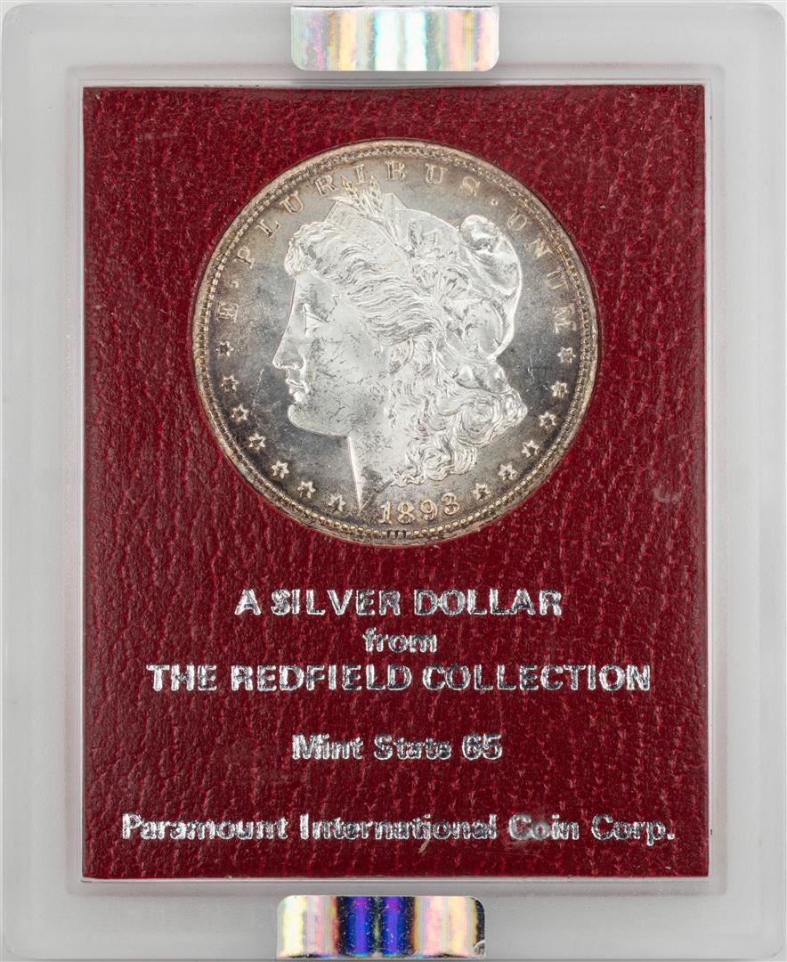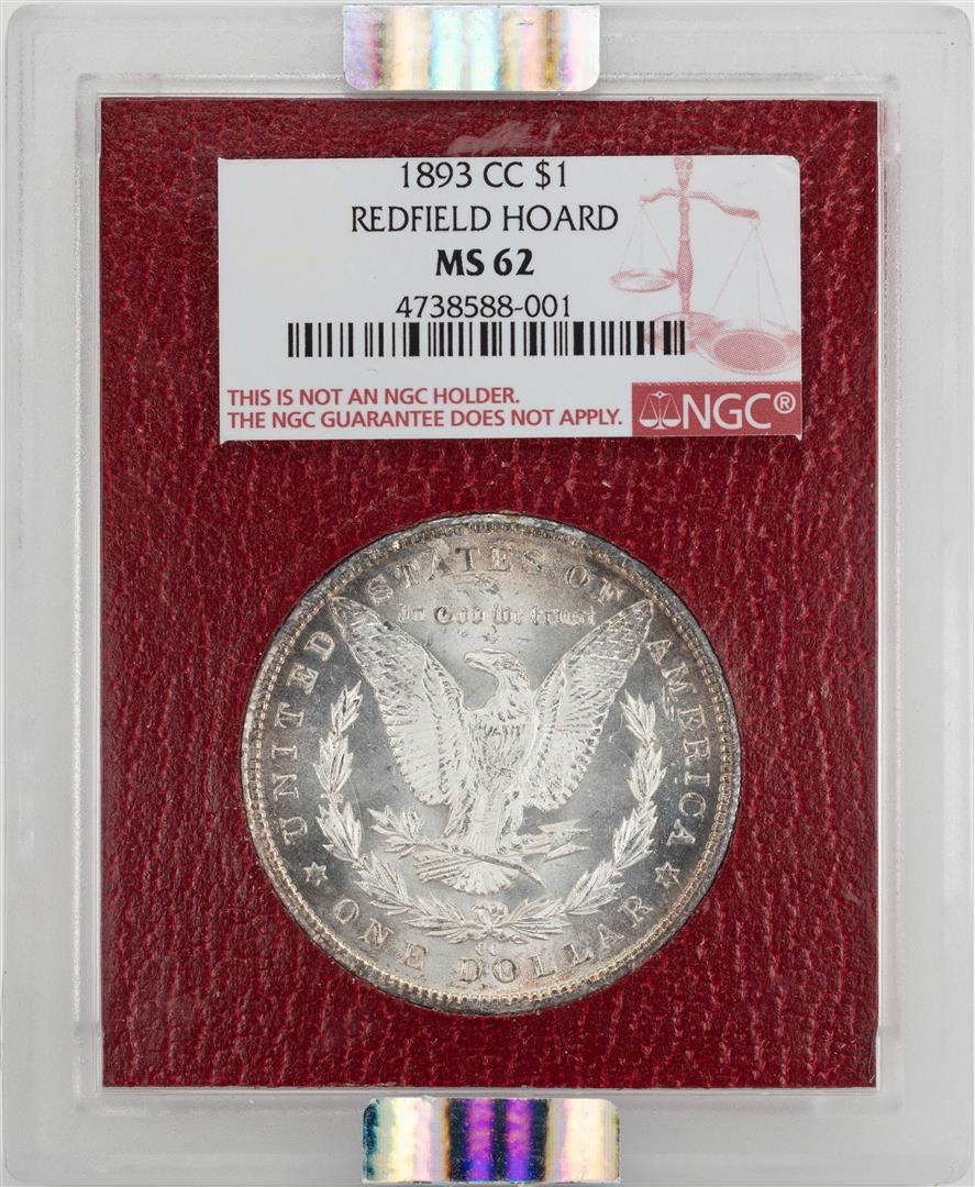 One Redfield 1893-CC $1 Morgan Silver Dollar Coin NGC MS62. NGC Certified.