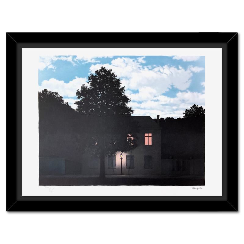 "L'Empire des Lumieres" is a limited edition lithograph by Rene Magritte (1898-1967). This piece is numbered 109/300 and bears the dry stamps of the Magritte Foundation & ADAGP (Society of Authors in the Graphic and Plastic Arts) and is signed by the President of the Magritte Foundation, Charly Herscovici. This piece comes custom framed. Includes Certificate of Authenticity. Measures approx. 33.5" x 29" (frame), 27.5" x 23" (image).
