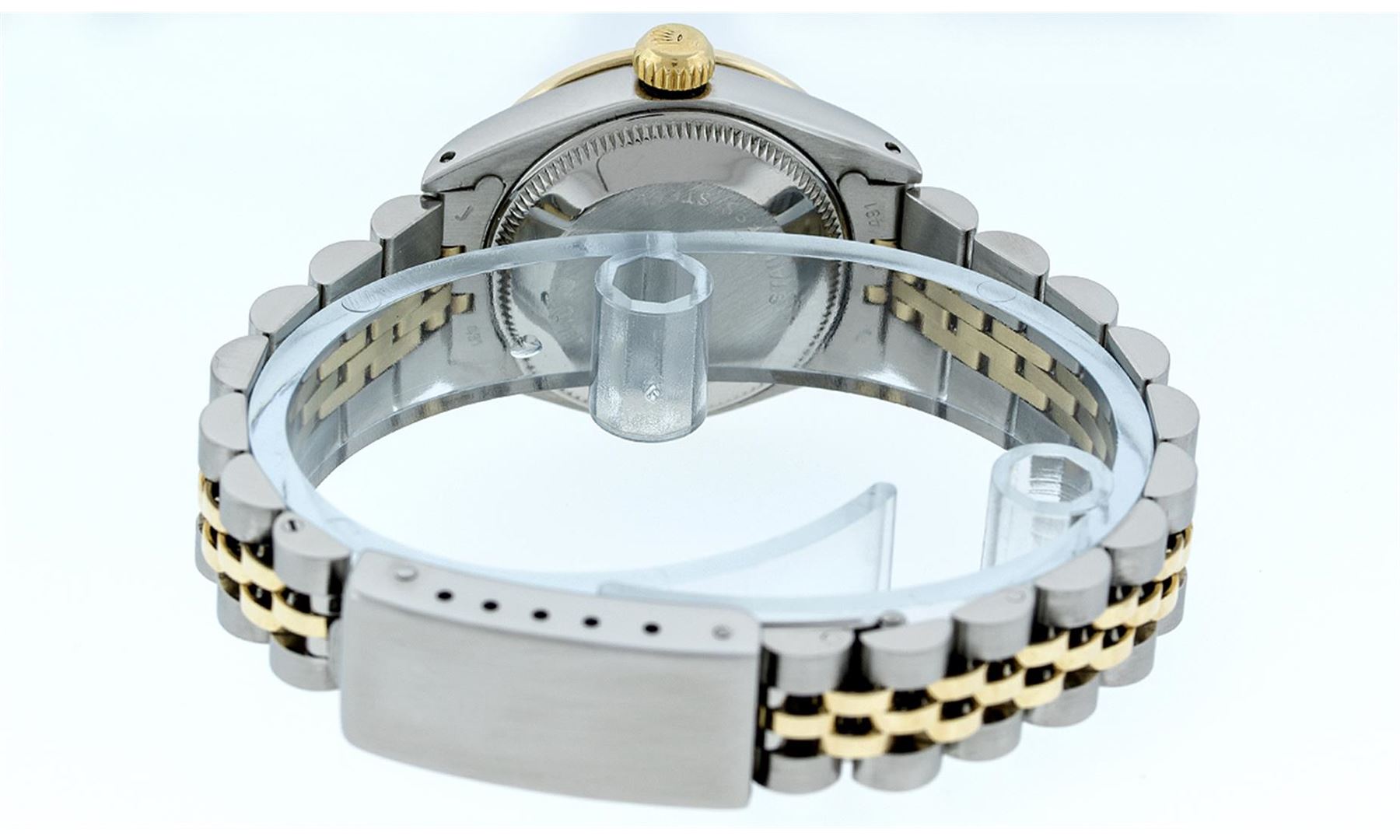 One Ladies Two Tone Rolex Datejust Polished, Serviced & Electronically Tested, 14K Yellow Gold & Stainless Steel Case:26mm, 14K Yellow Gold Crown, Custom Bezel: 18K Yellow Gold Ruby Beadset Diamond Bezel, Diamond Count:  28 Diamonds + 4 Rubies  Total Weight .70 Carat, Clarity: Si-VS, Color: G to H. Custom Crystal: Synthetic Sapphire Cyclops Lens. Movement: Automatic Winding Movement Caliber 2030. Custom Dial: Dark Red Vignette With Diamond Hour Markers. 10 Diamonds In Dial, Clarity: Si-VS, Color: G to H. Date Window: 3 O'Clock Position Date Display, Non Quickset, Model: Datejust Condition: G-6 Extra Fine. Bracelet: Two Tone 14K Yellow Gold & Stainless Steel Jubilee. Bright Polish. 6.0 Inch Length, Adjustable. Standard Clasp, With Rolex Logo.