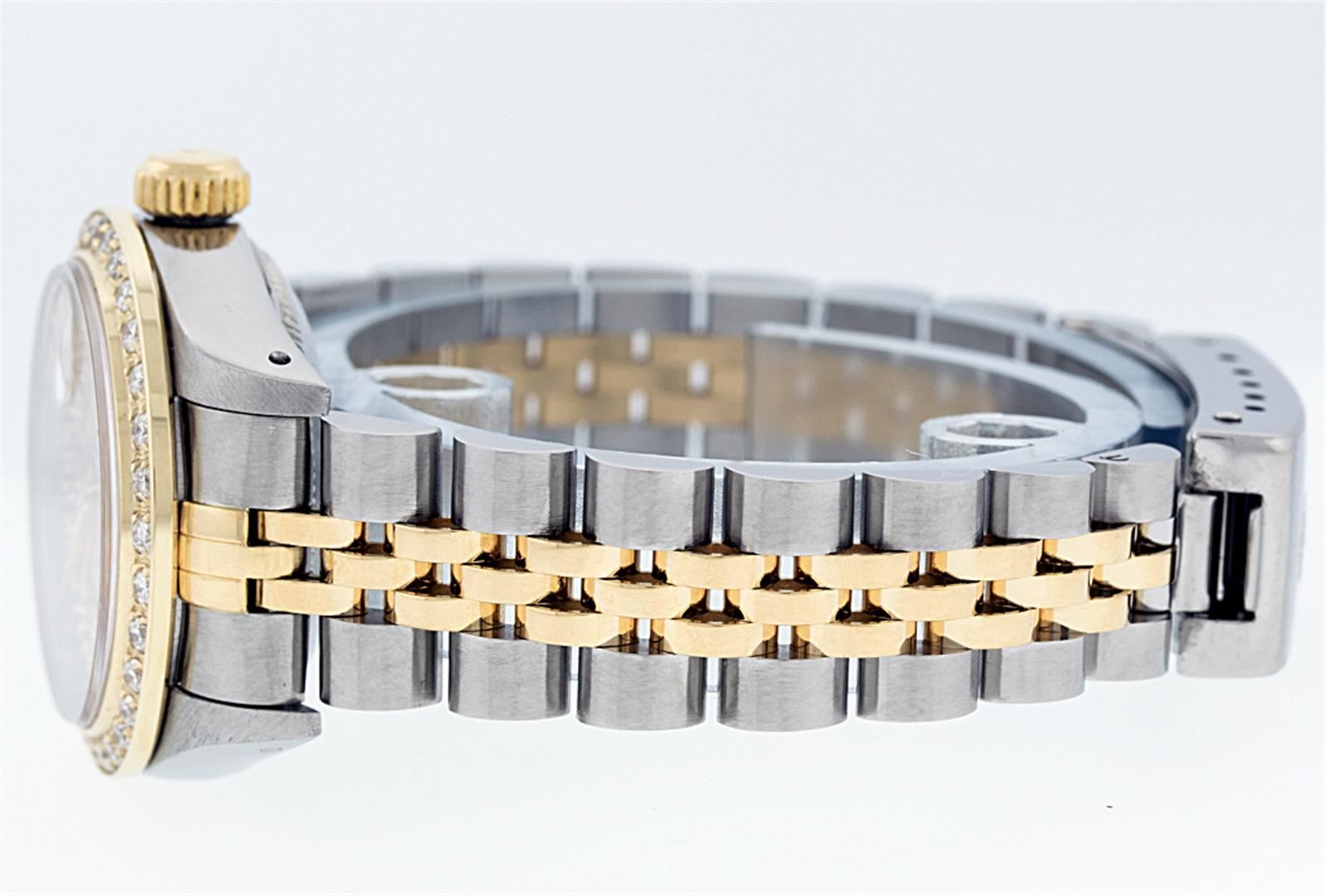 One Ladies Rolex Datejust Polished Bright with Satin Finish, Serviced & Electronically Tested, Stainless Steel Case:26mm, Yellow Gold Crown. Custom Bezel: 18K Yellow Gold Diamond Beadset Bezel, Diamond Count: 32 Diamonds, Total Weight .70 Carat, Clarity: SI-VS, Color: G to H. Custom Crystal: Synthetic Sapphire Cyclops Lens. Movement: Automatic Winding Movement Caliber 2135. Custom Dial: Refinished Champagne String Diamond Dial, Diamond Count: 43 Diamonds in Dial G To H In Color, Clarity: VS. Date Window: 3 O'Clock Position Date Display, Quickset, Model: 69173 Condition: G-6 Extra Fine. Bracelet: 18K Yellow Gold & Stainless Steel Jubilee. Bright Polish & Satin Finish. 6.0 Inch Length, Adjustable. Standard Clasp, With Rolex Logo.