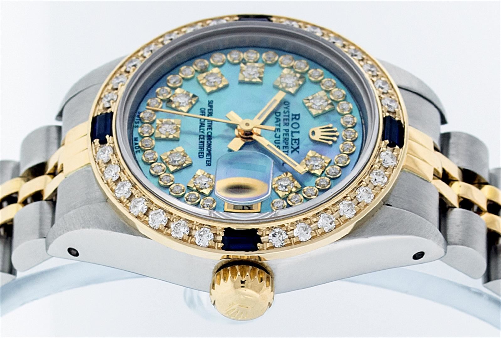 One Ladies Rolex Datejust Polished Bright with Satin Finish, Serviced & Electronically Tested, Stainless Steel Case:26mm, Yellow Gold Crown. Custom Bezel: 18K Yellow Gold Sapphire Beadset Bezel, Diamond Count: 28 Diamonds + 4 Sapphires, Total Weight 1.00 Carat, Clarity: SI-VS, Color: G to H. Custom Crystal: Synthetic Sapphire Cyclops Lens. Movement: Automatic Winding Movement Caliber 2135. Custom Dial: Refinished Blue MOP String Diamond Dial, Diamond Count: 43 Diamonds in Dial G To H In Color, Clarity: VS. Date Window: 3 O'Clock Position Date Display, Quickset, Model: 69173 Datejust. Condition: G-6 Extra Fine. Bracelet: 18K Yellow Gold & Stainless Steel Jubilee. Bright Polish & Satin Finish. 6.0Inch Length, Adjustable. Standard Clasp, With Rolex Logo.