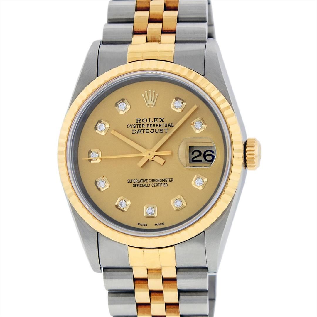 One Gents 18K Yellow Gold Two Tone Rolex Datejust Polished, Serviced & Electronically Tested Watch, 18K Yellow Gold & Stainless Steel Case Size:36mm. Bezel: 18K Yellow Gold Fluted Bezel. Custom Crystal: Synthetic Sapphire Cyclops Lens. Movement: Automatic Winding Movement Caliber 3135. Custom Dial: Champagne Diamond Dial, Diamond Count: 10 Diamonds In Dial, Color: G To H, Clarity: SI-VS, Date Window: 3 O'Clock Position Date Display, Quickset, Model: 16233 Condition: G-6 Extra Fine The Watch Is In Very Good Condition Free Of All Scratches And Dents. Bracelet: Two Tone 18K Yellow Gold & Stainless Steel Jubilee Band. Bright Polish. 7.0 Inch Length, Adjustable. Standard Clasp, With Rolex Logo.