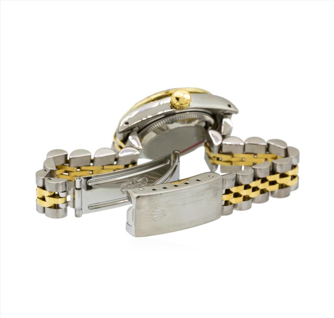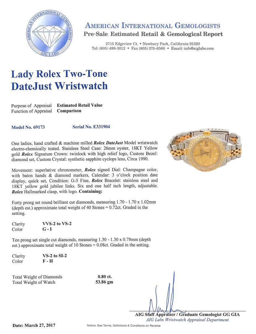 One ladies, hand crafted & machine milled Rolex DateJust Model wristwatch electro-chemically tested. Stainless Steel Case: 26mm oyster, 18KT Yellow gold Rolex Signature Crown: twin lock with high relief logo, Custom Bezel: diamond set, Custom Crystal: synthetic sapphire cyclops lens, Circa 1990. Movement: superlative chronometer, Rolex signed Dial: Champagne color, with baton hands & diamond markers, Calendar: 3 o'clock position date display, quick set, Condition: G-5 Fine, Rolex Bracelet: stainless steel and 18KT yellow gold jubilee links. Six and one half inch length, adjustable. Rolex Hallmarked clasp, with logo. Containing: Forty prong set round brilliant cut diamonds, measuring 1.70 - 1.70 x 1.02mm (depth est.) approximate total weight of 40 Stones = 0.72ct. Graded in the setting. Clarity: VVS-2 to VS-2. Color: G - I Ten prong set single cut diamonds, measuring 1.30 - 1.30 x 0.78mm (depth est.) approximate total weight of 10 Stones = 0.08ct. Graded in the setting. Clarity: VS-2 to SI-2. Color: F - H. Total Weight of Diamonds 0.80ct. Total Weight of Watch 53.86gm. AIG Appraised.