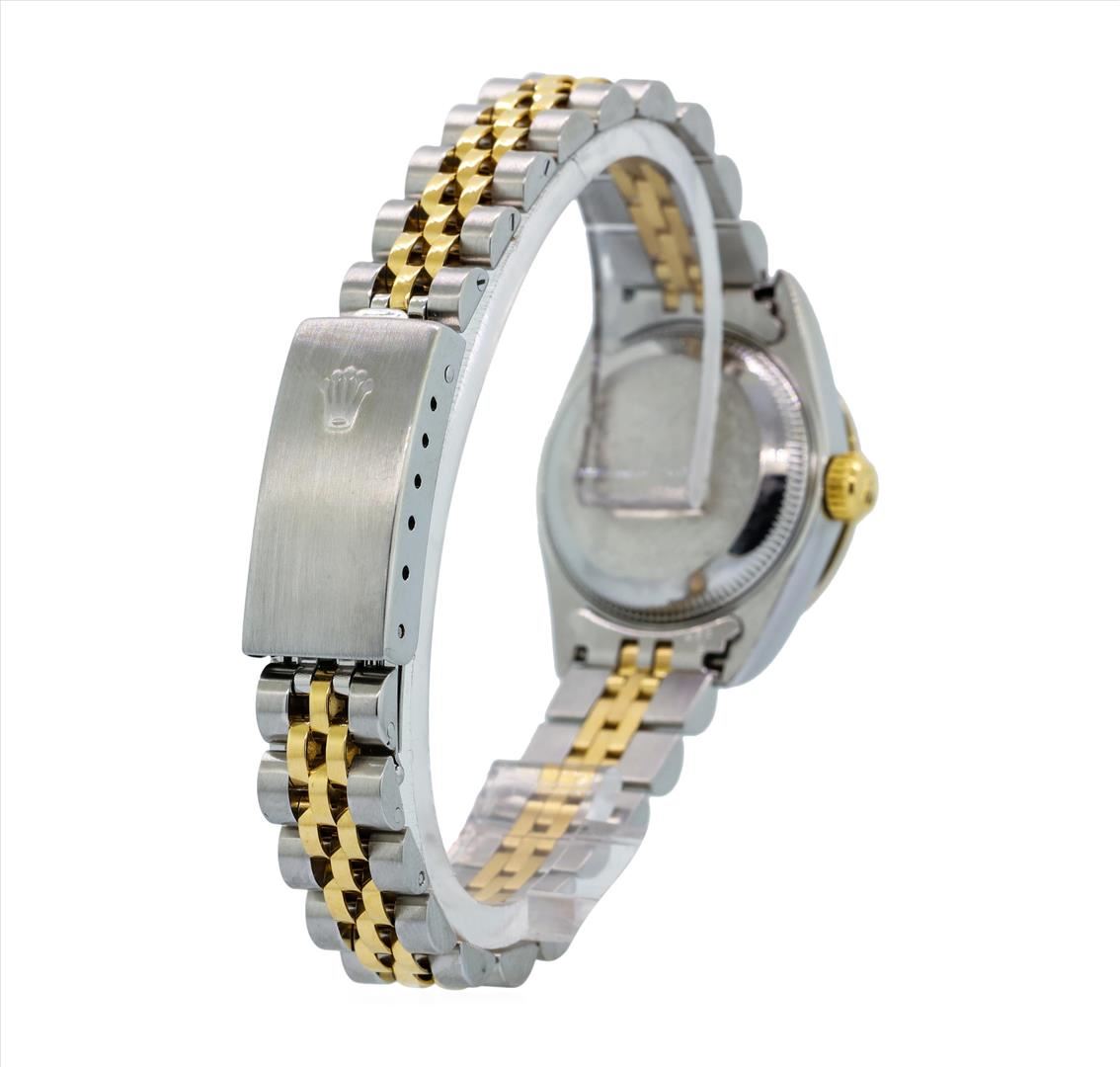 One ladies, hand crafted & machine milled Rolex DateJust Model wristwatch electro-chemically tested. Stainless Steel Case: 26mm oyster, 18KT Yellow gold Rolex Signature Crown: twinlock with high relief logo, Custom Bezel: diamond set, Custom Crystal: synthetic sapphire cyclops lens, Circa 1996. Movement: superlative chronometer, Custom Dial: mother of pearl, with baton hands & diamond markers, Calendar: 3 o'clock position date display, quick set, Condition: G-5 Fine, Rolex Bracelet: stainless steel and 18KT yellow gold jubilee links. Seven and one quarter length, adjustable. Rolex Hallmarked clasp, with logo. Containing: Thirty-Two prong set round brilliant cut diamonds, measuring 1.70 - 1.70 x 1.02mm (depth est.) approximate total weight of 32 Stones = 0.58ct. Graded in the setting. Clarity: SI-1 to SI-2. Color: G - I Ten prong set single cut diamonds, measuring 1.30 - 1.30 x 0.78mm (depth est.) approximate total weight of 10 Stones = 0.08ct. Graded in the setting. Clarity: VS-1 to SI-1. Color: G - H. Total Weight of Diamonds 0.66ct. Total Weight of Watch56.18gm. Containing: Thirty-Two prong set round brilliant cut diamonds, measuring 1.70 - 1.70 x 1.02mm (depth est.) approximate total weight of 32 Stones = 0.58ct. Graded in the setting. Clarity: SI-1 to SI-2. Color: G - H Ten prong set single cut diamonds, measuring 1.30 - 1.30 x 0.78mm (depth est.) approximate total weight of 10 Stones = 0.08ct. Graded in the setting. Clarity: VS-1 to SI-1. Color: G - H. Total Weight of Diamonds 0.66ct. AIG Appraised.