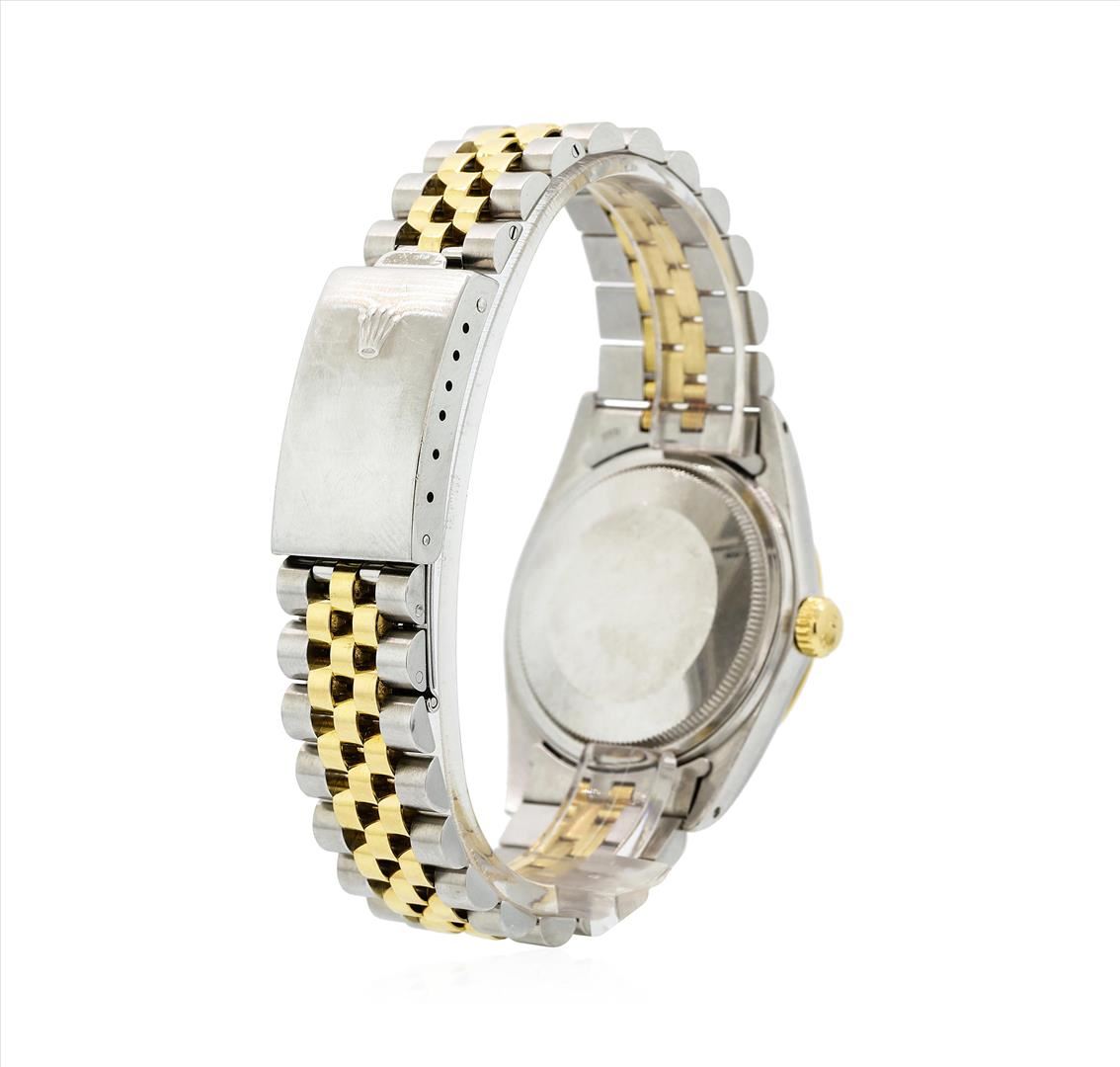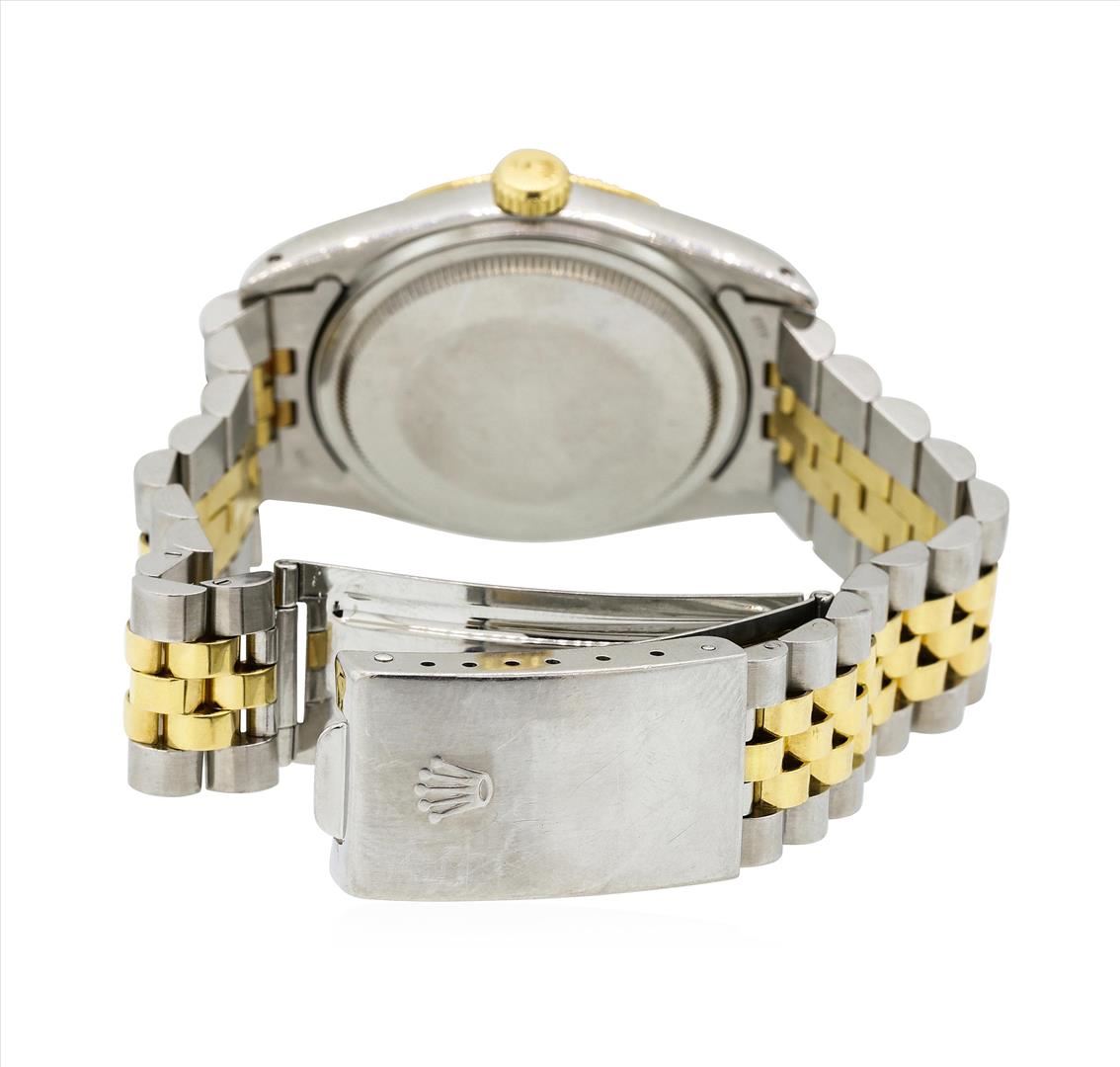 One gents, hand crafted & machine milled Rolex two-tone DateJust model wristwatch electro-chemically tested. Stainless Steel Case: 36mm oyster, Rolex Signature 18KT yellow gold Crown: twin lock with logo, 18KT yellow gold Bezel: fluted, Crystal: acrylic cyclops lens, Circa: 1986.Movement: superlative chronometer, Rolex signed Dial: Champagne color, with baton hands and raised indices, Calendar: 3 o'clock position, quick set. Rolex Bracelet: two-tone Stainless Steel & 18KT yellow gold jubilee links, Condition: G-5 Fine. Seven and one half inch length, adjustable. Rolex hallmarked clasp, with logo. Total Weight of Watch 99.48gm. AIG Appraised.