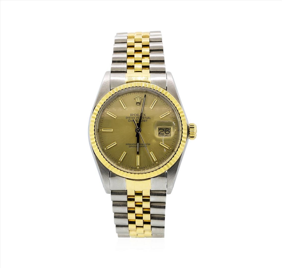 One gents, hand crafted & machine milled Rolex two-tone DateJust model wristwatch electro-chemically tested. Stainless Steel Case: 36mm oyster, Rolex Signature 18KT yellow gold Crown: twin lock with logo, 18KT yellow gold Bezel: fluted, Crystal: acrylic cyclops lens, Circa: 1986.Movement: superlative chronometer, Rolex signed Dial: Champagne color, with baton hands and raised indices, Calendar: 3 o'clock position, quick set. Rolex Bracelet: two-tone Stainless Steel & 18KT yellow gold jubilee links, Condition: G-5 Fine. Seven and one half inch length, adjustable. Rolex hallmarked clasp, with logo. Total Weight of Watch 99.48gm. AIG Appraised.