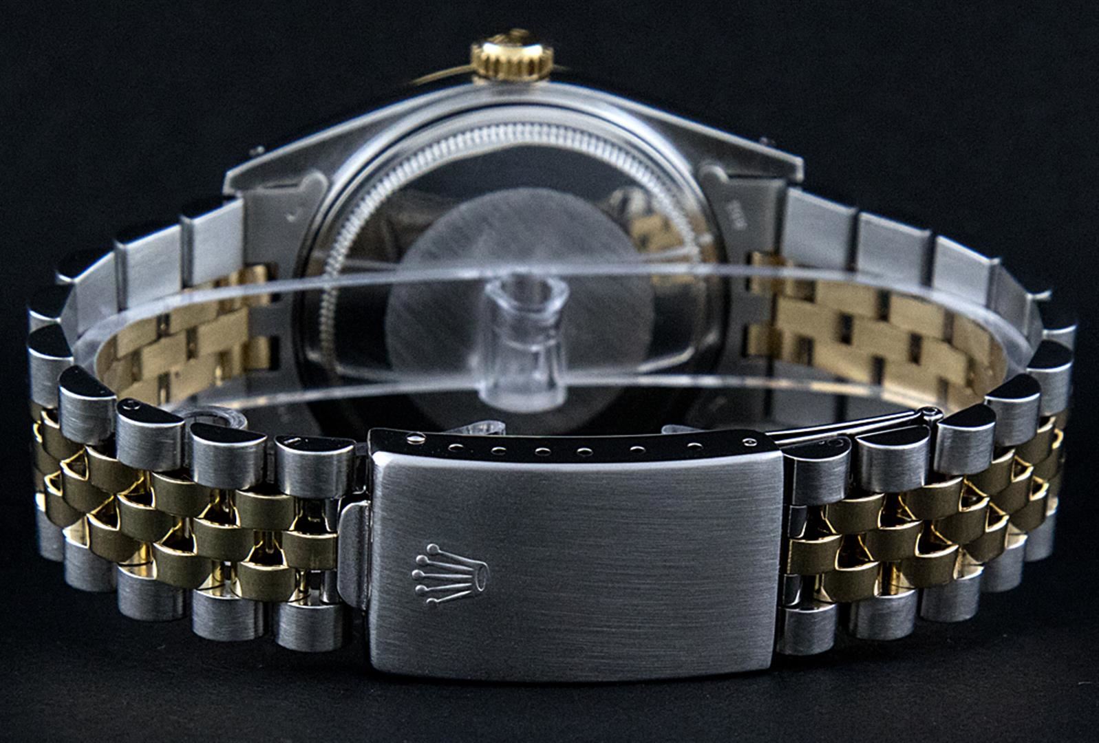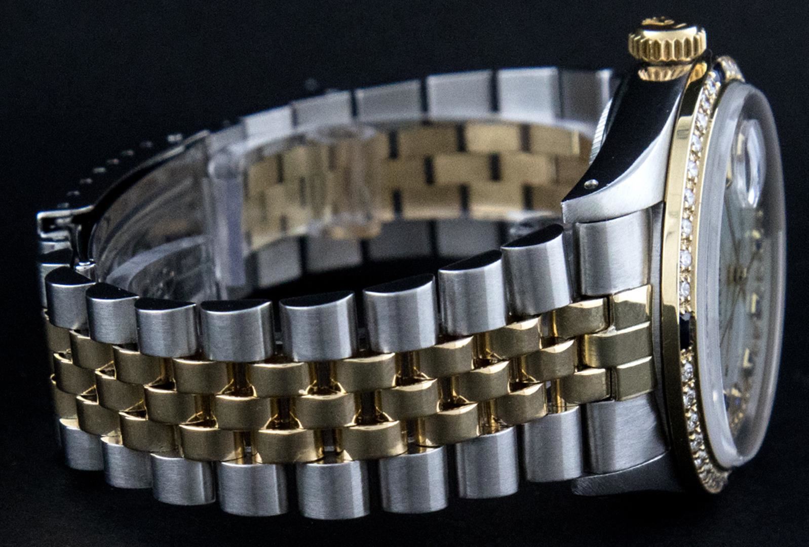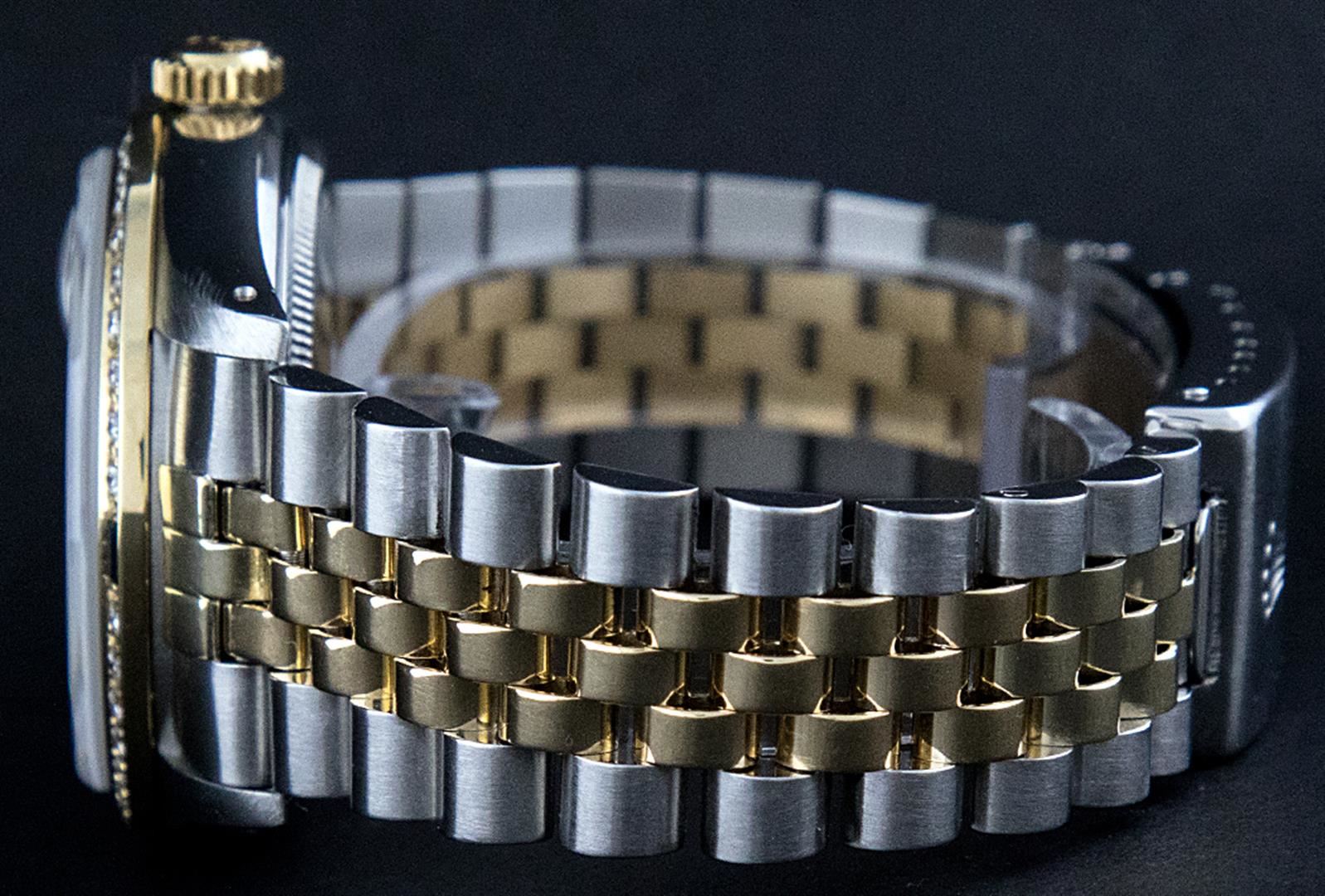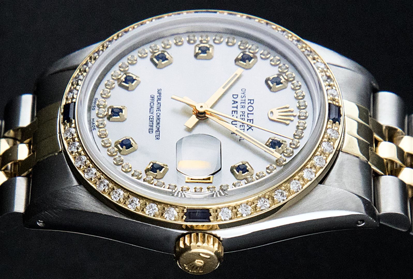 One Mens Two Tone Rolex Datejust Polished, Serviced & Electronically Tested, 18K Yellow Gold & Stainless Steel Case:36mm, 18K Yellow Gold Crown, Custom Bezel: 18K Yellow Gold Sapphire Beadset Diamond Bezel, Diamond Count: 36 Diamonds + 4 Sapphires Total Weight 1.00 Carat, Clarity: Si-VS, Color: G to H. Custom Crystal: Synthetic Sapphire Cyclops Lens. Movement: Automatic Winding Movement Caliber 3135. Custom Dial: Mother Of Pearl Sapphire String Diamond Dial , Diamond + Gem Count: 10 Sapphires + 48 Diamonds in Dial G To H In Color, SI-VS Clarity. Date Window: 3 O'Clock Position Date Display, Quickset, Model: 16233 Sapphire Datejust. Condition: G-6 Extra Fine. Bracelet: Two Tone 18K Yellow Gold & Stainless Steel Rolex Jubilee Band. Bright Polish. 7.0 Inch Length, Adjustable. Standard Clasp, With Rolex Logo.