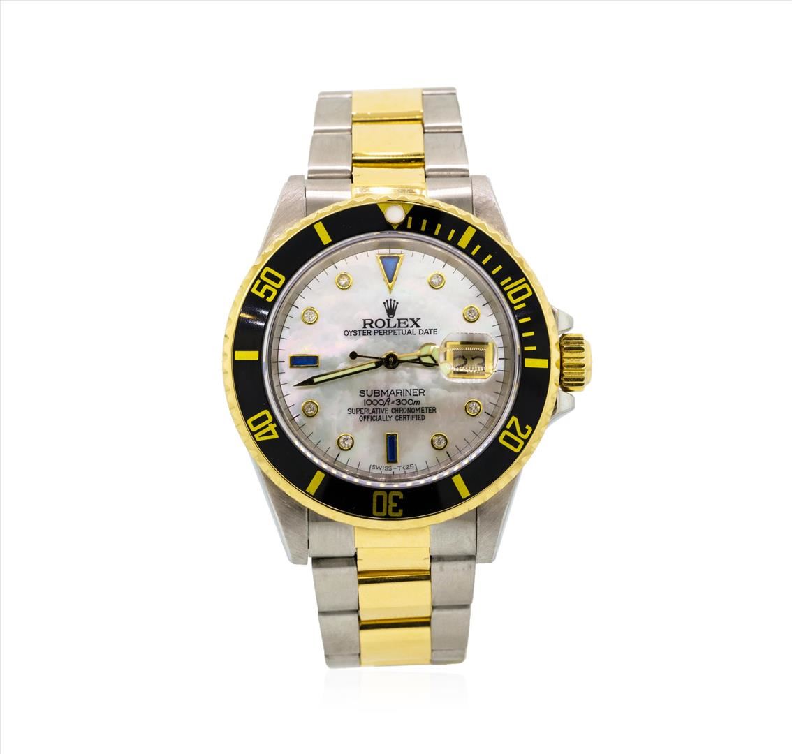 One gents, hand crafted & machine milled Rolex two tone Submariner Date wristwatch electro-chemically tested. Stainless Steel Case: 40mm oyster, manufacturer's specifications for Water Resistance: 300 meters / 1000 feet, Rolex signature 18KT yellow gold Crown: twin lock, set within protective shoulders, Rotating 18KT yellow gold Bezel: Black disc, uni-directional, for up to sixty minute time lapse, Crystal: synthetic sapphire cyclops lens. Movement: superlative chronometer, Custom Dial: mother of pearl, with pointed hands and sapphire & diamond markers, Circa: 1987, Calendar: quick set. Rolex Bracelet: two tone Stainless Steel & 18KT yellow gold oyster links, Rolex Hallmarked oyster flip lock clasp with diver's extension, Condition: G-6 Extra Fine. Seven and one half inch length, adjustable. Total Weight of Watch 136.38gm. AIG Appraised.