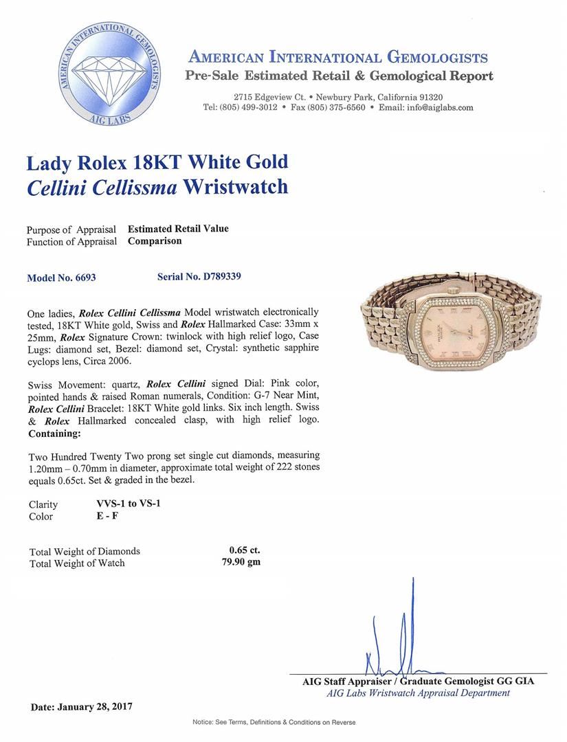 One ladies, Rolex Cellini Cellissma Model wristwatch electronically tested, 18KT White gold, Swiss and Rolex Hallmarked Case: 33mm x 25mm, Rolex Signature Crown: twinlock with high relief logo, Case Lugs: diamond set, Bezel: diamond set, Crystal: synthetic sapphire cyclops lens, Circa 2006. Swiss Movement: quartz, Rolex Cellini signed Dial: Pink color, pointed hands & raised Roman numerals, Condition: G-7 Near Mint, Rolex Cellini Bracelet: 18KT White gold links. Six inch length. Swiss & Rolex Hallmarked concealed clasp, with high relief logo. Containing: Two Hundred Twenty Two prong set single cut diamonds, measuring 1.20mm - 0.70mm in diameter, approximate total weight of 222 stones equals 0.65ct. Set & graded in the bezel. Clarity: VVS-1 to VS-1. Color: E - F. Total Weight of Diamonds 0.65ct. Total Weight of Watch 79.90gm. Comes with original papers. AIG Appraised.