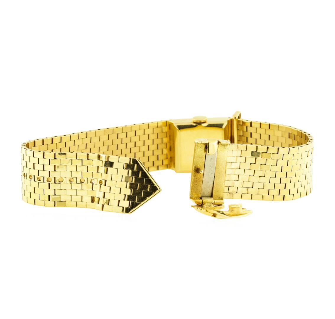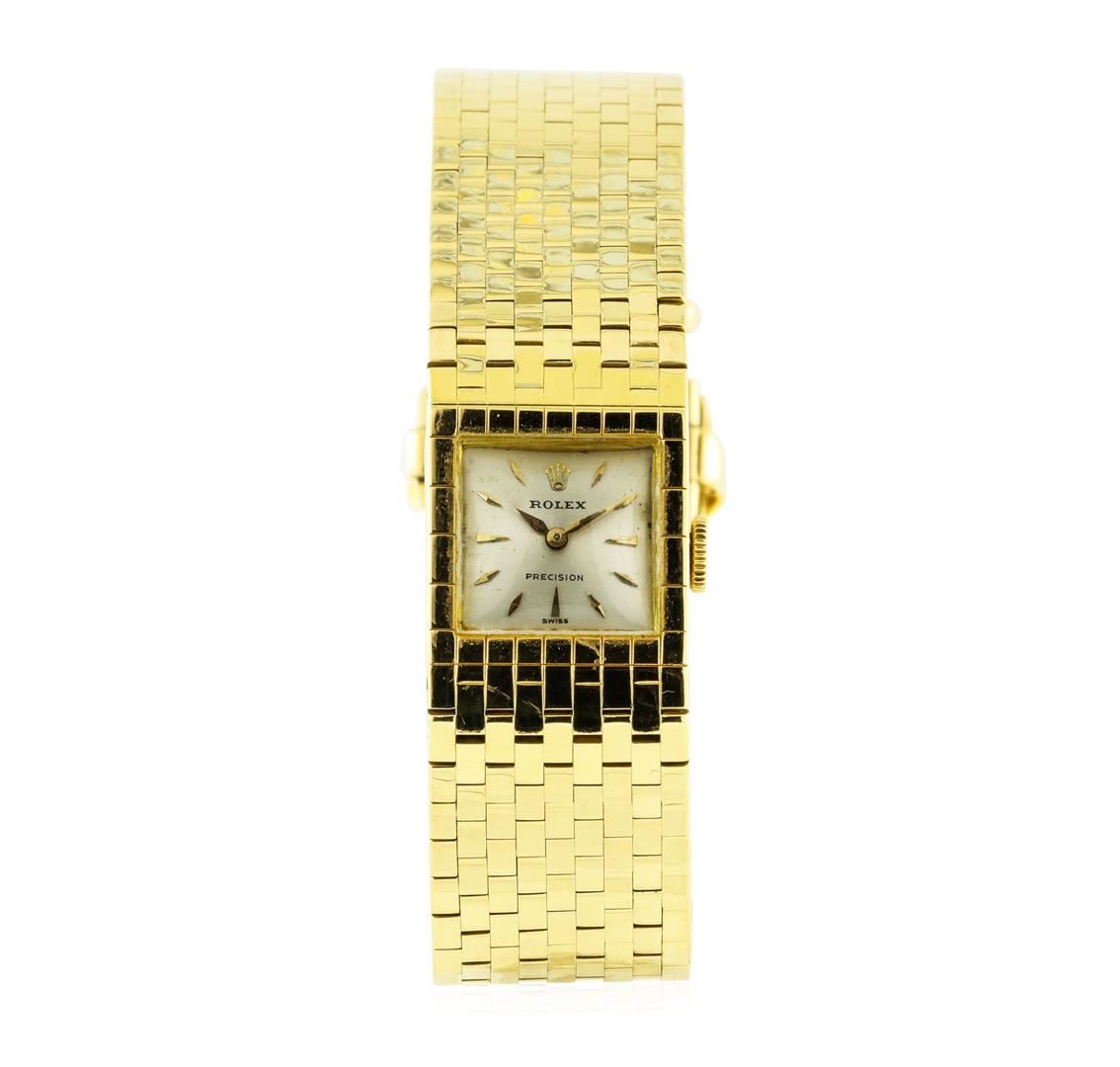 One Rolex 18KT yellow gold lady's bracelet wristwatch with a 17-jewel manual wind movement, model number 395455. The wristwatch has a square case measuring sixteen millimeters wide and an attached brick link buckle bracelet.