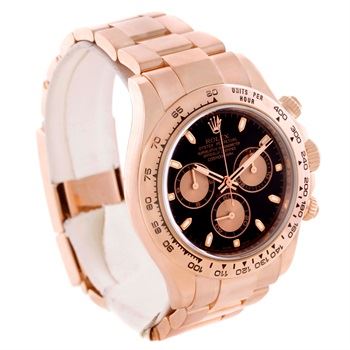 One Rolex Cosmograph Daytona 18K Rose Gold Chronograph Watch. The watch is in excellent condition and the details are as follows: Model Number: 116505, Movement: Officially certified chronometer 44 Jewels self-winding movement, Caliber: 4130, Case: 18K rose gold case 40.0 mm in diameter, Special screw-down push buttons, Screw-down case back, Chronograph pushers and crown with guards, Bezel: 18K rose gold bezel calibrated for 400 units, Crystal: Scratch resistant sapphire crystal, Dial: Black dial with luminous hands and hour markers, 3 engine turned subdials for 12-hour and 30-minute registers, and constant seconds, Outer minute and 1/5 seconds divisions, Bracelet: 18K rose gold oyster bracelet with flip-lock clasp.