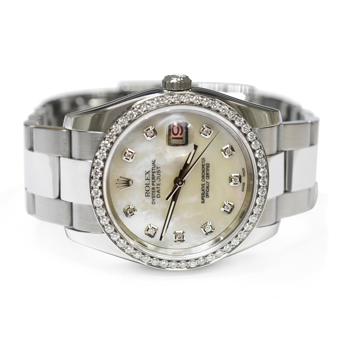 Rolex Unisex Datejust Stainless Steel 36mm Mother of Pearl Diamond Dial Watch Polished & Electronically Tested. Model: Datejust. Case: Stainless Steel. Bezel: Custom made diamond bezel with round brilliant diamonds all set in prong setting. Total Diamond Weight: 0.90ctw. Clarity: VS-SI Color: G-H. Crystal: Sapphire Crystal. Bracelet: Stainless Steel, Adjustable Standard Clasp with Rolex Logo. Dial: Mother of Pearl. Date Window: 3 O'clock Position. Movement: Automatic Winding Movement. Water Resistant: Yes. Case Size: 36mm. Condition: Pre Owned, Watch is free of all Scratches and Dents, Extra Fine G-6.