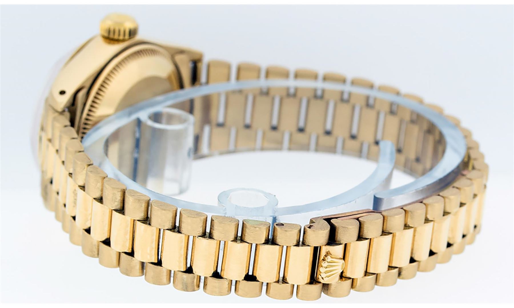 One Ladies Pre Owned Rolex 18K Yellow Gold President Polished, Serviced & Electronically Tested, Rolex 18K Yellow Gold Case: 26mm, Rolex 18K Yellow Gold Crown, Rolex Bezel: 18K Yellow Gold Fluted Bezel. Custom Crystal: New Acrylic Cyclops Lens. Rolex Movement: Custom Hands: New Luminescent Hands. Automatic Winding Movement. Custom Dial: Refinished To Blue Vignette With Added Single Cut Diamonds, Color: G to H, Diamond Count: 10 Diamonds In Dial, Clarity: SI-VS. Date Window: 3 O'Clock Position, Model: Datejust. Condition: G-6 Extra Fine The Watch Is In Very Good Condition Free Of All Scratches And Dents. Rolex Bracelet: 18K Yellow Gold President Band, Bright & Satin Polish. 6.0 Inch Length, Standard President Clasp (Hidden Clasp), With Rolex Logo.
