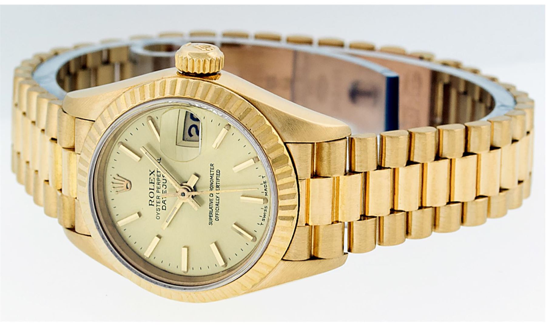 One Ladies Pre Owned Quickset Rolex 18K Yellow Gold President Polished, Serviced & Electronically Tested, Rolex 18K Yellow Gold Case: 26mm, Rolex 18K Yellow Gold Crown, Rolex Bezel: 18K Yellow Gold Fluted Bezel. Rolex Crystal: Sapphire With Cyclops Lens. Rolex Hands: Luminescent Hands. Rolex Movement: Automatic Winding Quickset Movement 2130. Rolex Dial: Champagne Index Dial With Dash Track & Lumi Dots. Date Window: 3 O'Clock Position, Model: President. Condition: G-6 Extra Fine. Rolex Bracelet: 18K Yellow Gold President Band, Bright & Satin Polish. 6.0 Inch Length, Standard President Clasp (Hidden Clasp), With Rolex Logo. The Watch Is In Very Good Condition Free Of All Scratches And Dents.