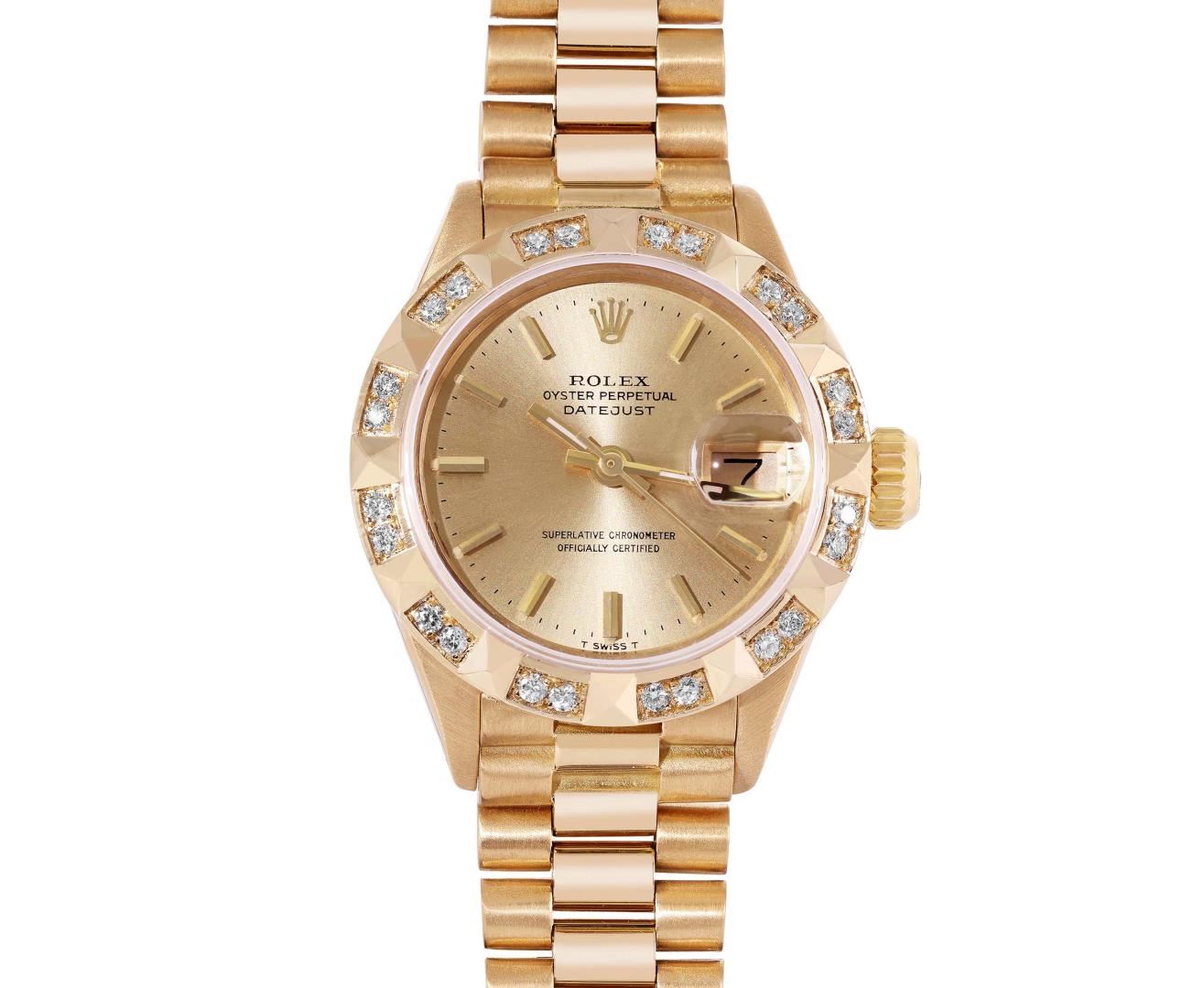 One Ladies Pre Owned Quickset Rolex 18K Yellow Gold President Polished, Serviced & Electronically Tested, Rolex 18K Yellow Gold Case: 26mm, Rolex 18K Yellow Gold Crown, Custom Bezel: New Pyramid Diamond Bezel, Diamond Count: 24 Diamonds On Bezel. Custom Crystal: New Sapphire With Cyclops Lens. Custom Hands: New Luminescent Hands. Rolex Movement: Rolex Automatic Movement Self Winding 2135. Rolex Dial: Factory Rolex Champagne Index Dial. Model: Quickset Datejust. Condition: G-6 Extra Fine, Rolex Bracelet: 18K Yellow Gold President Band, Bright & Satin Polish. 6.0 Inch Length, President Hidden Clasp, With Rolex Logo. This Watch Has Been Serviced Time Tested And Is In Excellent Condition It Is Free Of All Scratches And Dents. This Watch Comes With A Rolex Box.