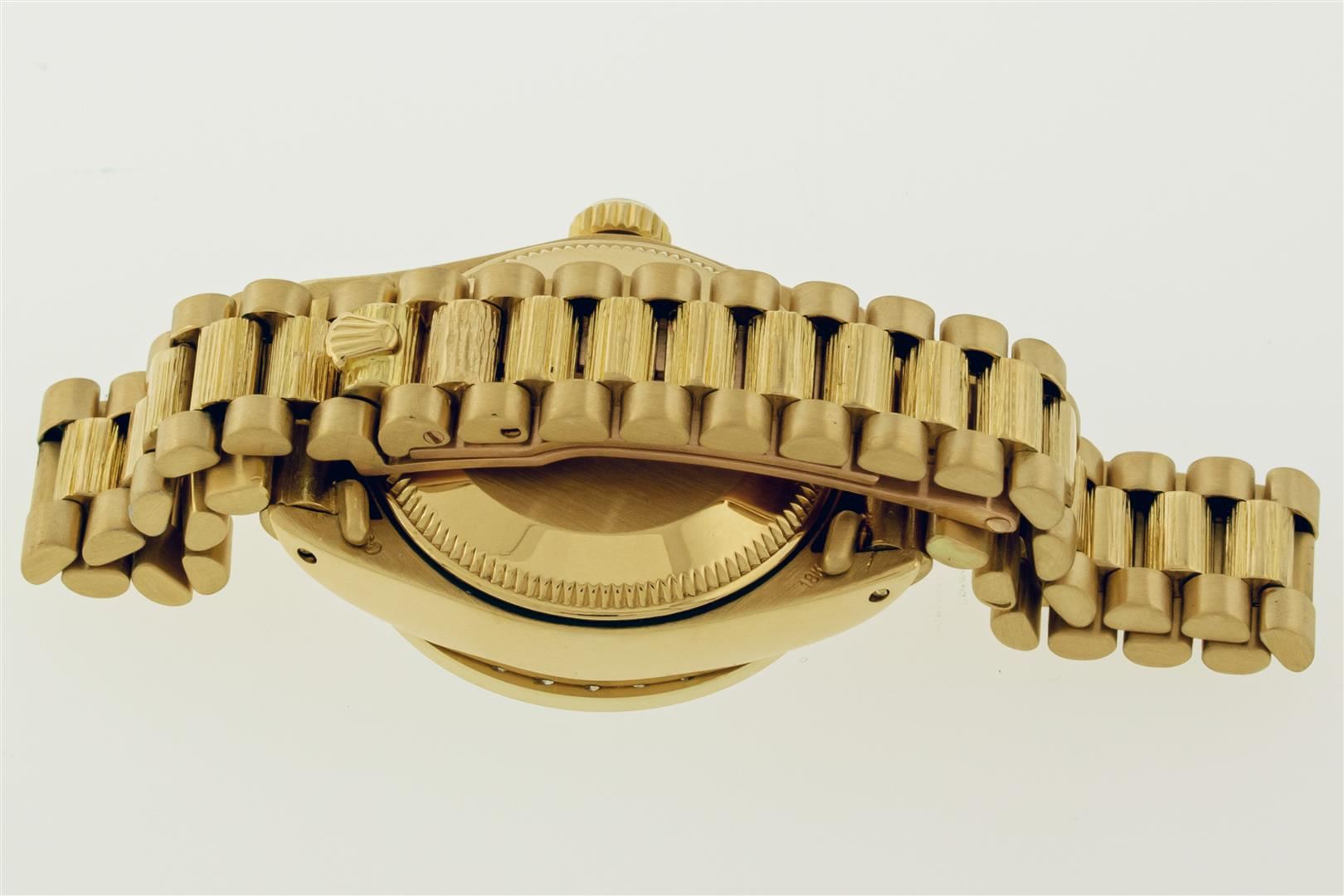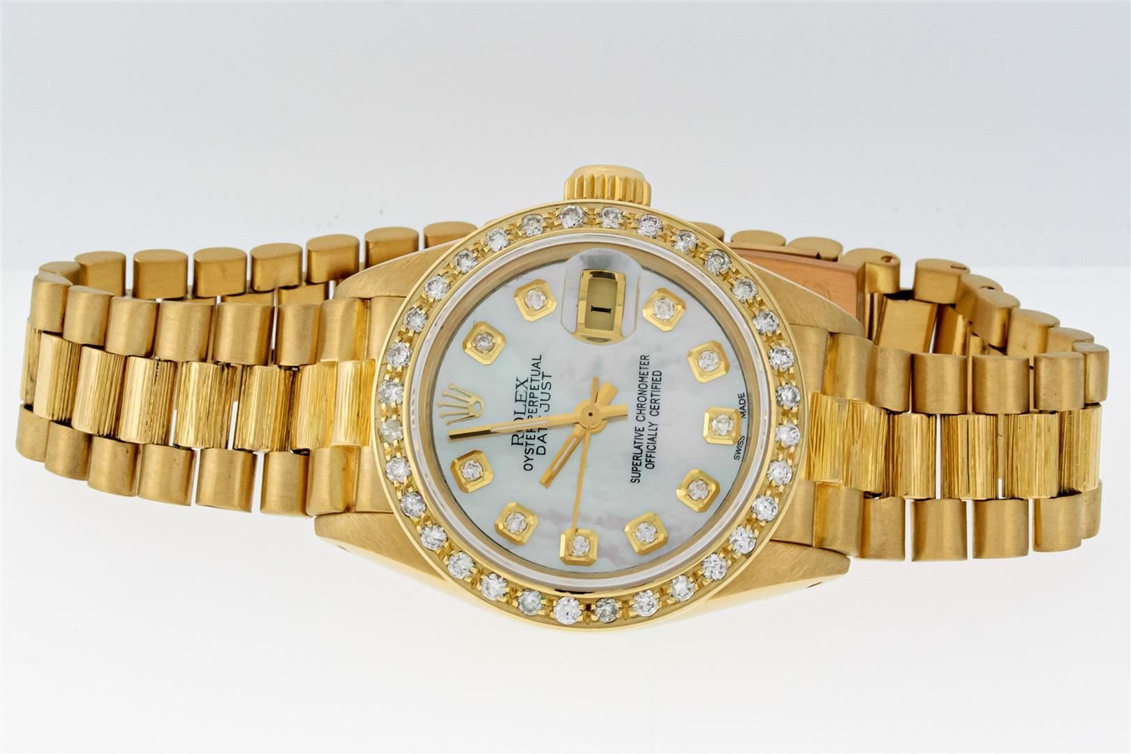 One Ladies Rolex 18K Yellow Gold President Polished, Serviced & Electronically Tested, Rolex 18K Yellow Gold Case: 26mm, Rolex 18K Yellow Gold Crown, Custom Bezel: New 18K Yellow Gold Bead Set Diamond Bezel, Diamond Count: 32 Diamonds, Clarity: SI-VS, Color: G to H. Custom Crystal: New Sapphire with Magnified Date Window. Rolex Movement: Automatic Winding Movement. Custom Dial: Mother Of Pearl with Diamond Dial, Color: G to H, Diamond Count: 10 Diamonds In Dial, Clarity: SI-VS. Date Window: 3 O'Clock Position, Model: Datejust. Condition: G-6 Extra Fine The Watch Is In Very Good Condition Free Of All Scratches And Dents. Rolex Bracelet: 18K Yellow Gold President Band with Bark Finish, Bright & Satin Polish. 6.0 Inch Length, Standard President Clasp (Hidden Clasp). This Pre Owned Watch Has Been Serviced And Polished It Is Free Of All Scratches And Dents.