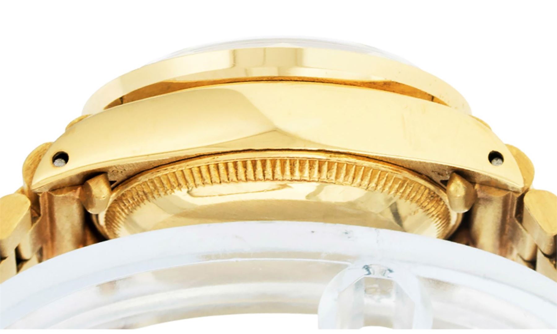 One Ladies Pre Owned 18K Yellow Gold Rolex President Polished, Serviced & Electronically Tested, Rolex Yellow Gold Case: 26mm, Rolex 18K Yellow Gold Crown, Custom Bezel: New 18K Yellow Gold Pyramid Bezel With Genuine Diamonds, Diamond Count: 24 Diamonds In Bezel. Total Weight .50 Carat, Clarity: SI-VS, Color: G to H. Custom Crystal: New Sapphire With Magnified Date Window. Custom Hands: New Luminescent Hands. Rolex Movement: Automatic Winding Movement. Rolex Dial: Champagne Index With Dash Track & Lumi Dots. Date Window: 3 O'Clock Position, Model: President, Condition: G-6 Extra Fine. Rolex Bracelet: 18K Yellow Gold President With Hidden Clasp, Bright & Satin Polish. 6.0 Inch Length, Standard President Clasp (Hidden Clasp), With Rolex Logo. This Watch Has Been Serviced Time Tested And Is In Excellent Condition It Is Free Of All Scratches And Dents.