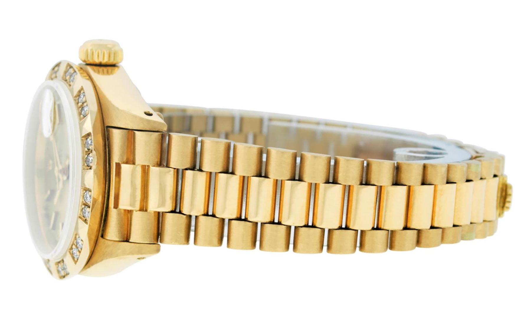 One Ladies Pre Owned 18K Yellow Gold Rolex President Polished, Serviced & Electronically Tested, Rolex Yellow Gold Case: 26mm, Rolex 18K Yellow Gold Crown, Custom Bezel: New 18K Yellow Gold Pyramid Bezel With Genuine Diamonds, Diamond Count: 24 Diamonds In Bezel. Total Weight .50 Carat, Clarity: SI-VS, Color: G to H. Custom Crystal: New Sapphire With Magnified Date Window. Custom Hands: New Luminescent Hands. Rolex Movement: Automatic Winding Movement. Rolex Dial: Champagne Index With Dash Track & Lumi Dots. Date Window: 3 O'Clock Position, Model: President, Condition: G-6 Extra Fine. Rolex Bracelet: 18K Yellow Gold President With Hidden Clasp, Bright & Satin Polish. 6.0 Inch Length, Standard President Clasp (Hidden Clasp), With Rolex Logo. This Watch Has Been Serviced Time Tested And Is In Excellent Condition It Is Free Of All Scratches And Dents.