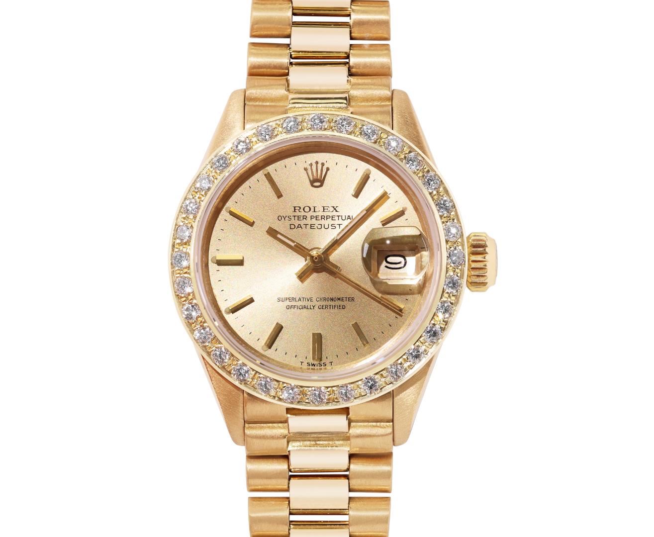 One Ladies Pre Owned Quickset Rolex 18K Yellow Gold President Polished, Serviced & Electronically Tested, Rolex 18K Yellow Gold Case: 26mm, Rolex 18K Yellow Gold Crown, Custom Bezel: New Beadset Diamond Bezel, Diamond Count: 32 Diamonds On Bezel. Custom Crystal: New Sapphire With Cyclops Lens. Custom Hands: New Luminescent Hands. Rolex Movement: Rolex Automatic Movement Self-Winding 2135. Rolex Dial: Factory Rolex Champagne Index Dial. Model: Quickset Datejust President. Condition: G-6 Extra Fine, Rolex Bracelet: 18K Yellow Gold President Band, Bright & Satin Polish. 6.0 Inch Length, President Hidden Clasp, With Rolex Logo. This Watch Has Been Serviced Time Tested And Is In Excellent Condition It Is Free Of All Scratches And Dents. This Watch Comes With A Rolex Box.