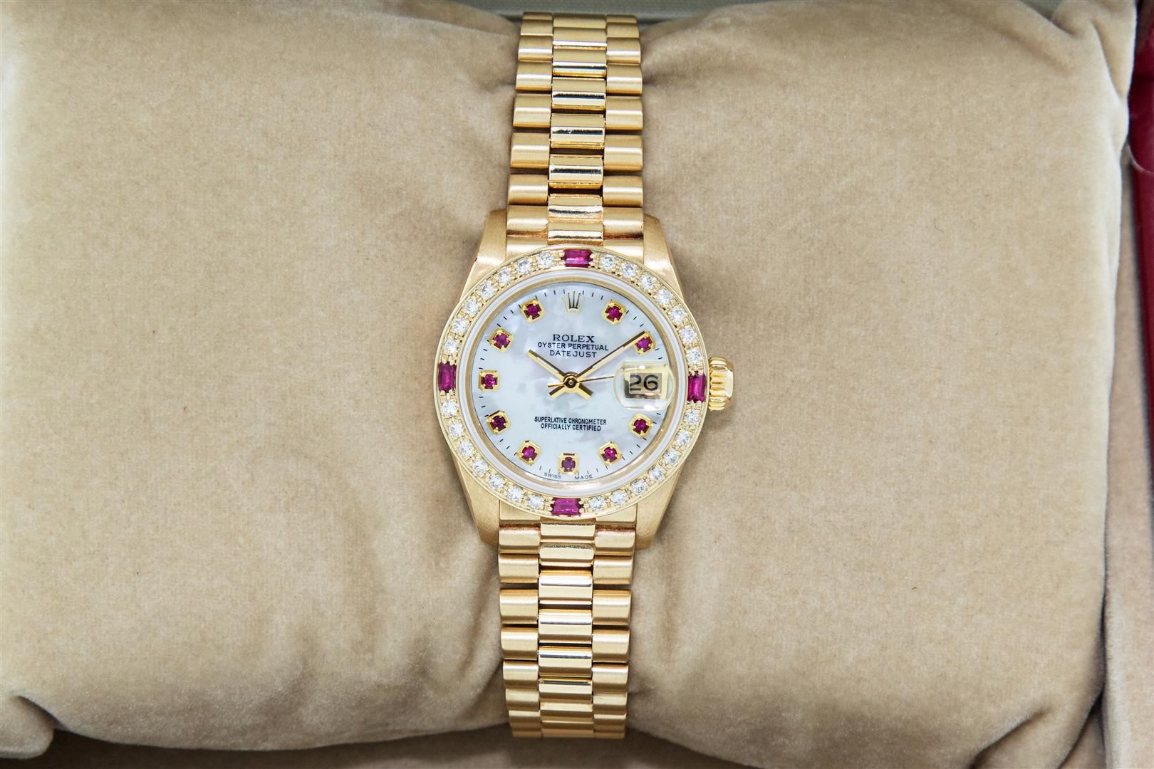 One Ladies 18K Yellow Gold Rolex President Polished, Serviced & Electronically Tested, Yellow Gold Case: 26mm, 18K Yellow Gold Crown, Custom Bezel: New 18K Yellow Gold Ruby Beadset Diamond Bezel, Diamond + Stone Count: 28 Diamonds + 4 Rubies. Custom Crystal: New Sapphire with Date Window. Custom Hands: New Luminescent Hands. Rolex Movement: Automatic Winding Movement. Custom Dial: Refinished Mother Of Pearl with Ruby Hour Markers, Stone Count: 10 Rubies In Dial. Date Window: 3 O'Clock Position, Model: President, Condition: G-6 Extra Fine. Rolex Bracelet: 18K Yellow Gold President with Hidden Clasp, Bright & Satin Polish. 6.0 Inch Length, Standard President Clasp (Hidden Clasp), with Rolex Logo. This Pre Owned Watch Has Been Serviced And Polished It Is Free Of All Scratches And Dents. This Watch Comes with A Rolex Box.