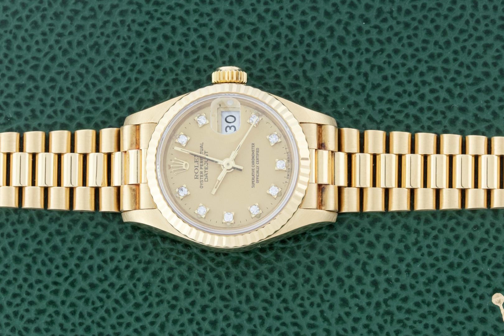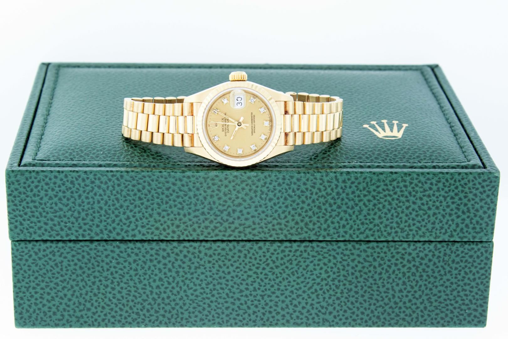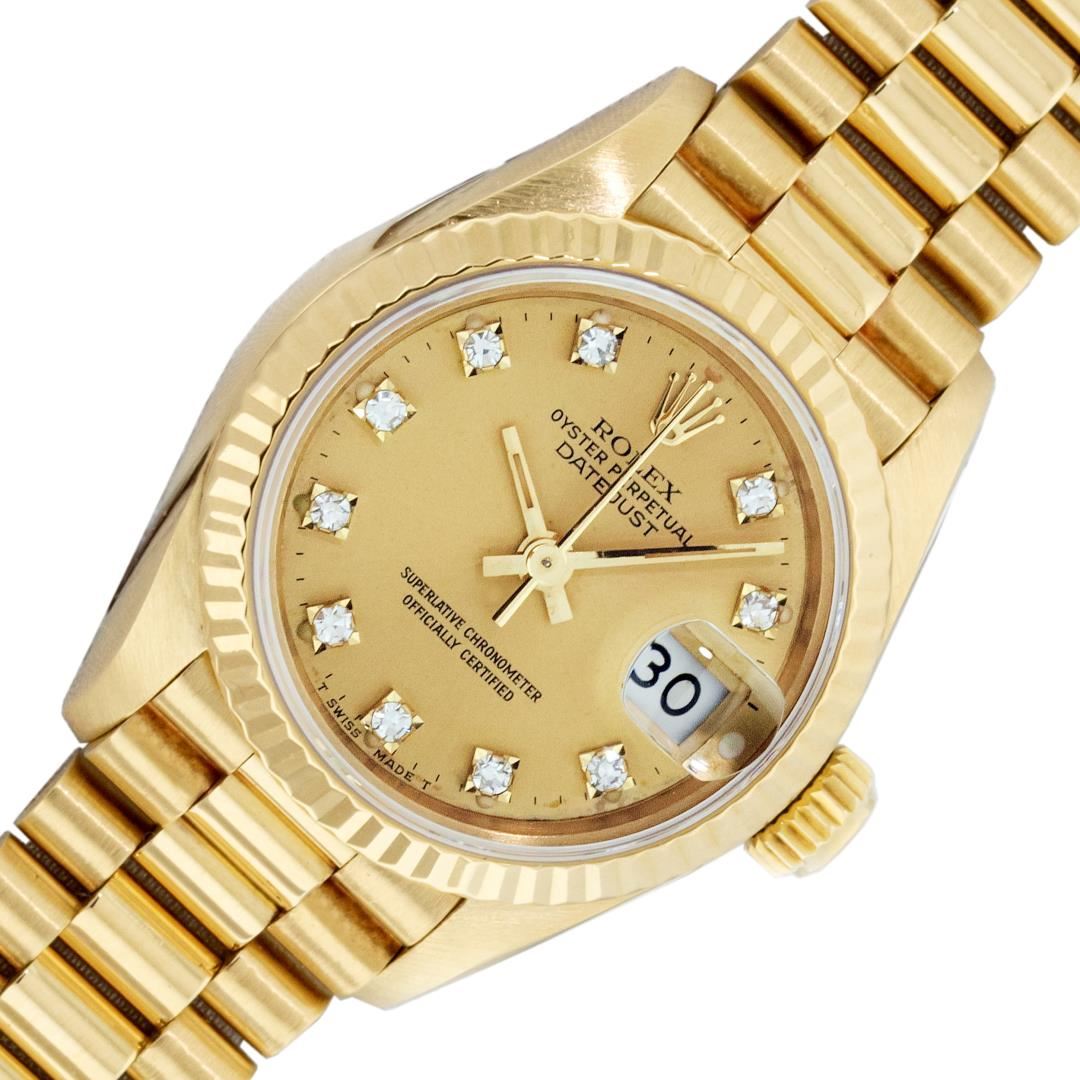 One Ladies Pre Owned Quickset Rolex 18K Yellow Gold President Polished, Serviced & Electronically Tested, Rolex 18K Yellow Gold Case: 26mm, Rolex 18K Yellow Gold Crown, Rolex Bezel: 18K Rolex Yellow Gold Fluted Bezel, Crystal: Sapphire With Cyclops Lens. Hands: Luminescent Hands. Rolex Movement: Automatic Winding Quickset Movement. Rolex Dial: Factory Rolex Champagne Diamond Dial, Diamond Count: 10 Diamonds In Dial, Clarity: VVS. Date Window: 3 O'Clock Position, Model: Datejust. Condition: G-6 Extra Fine, Rolex Bracelet: 18K Yellow Gold President Band, Bright & Satin Polish. 6.0 Inch Length, Standard President Clasp (Hidden Clasp), With Rolex Logo. This Watch Has Been Serviced Time Tested And Is In Excellent Condition It Is Free Of All Scratches And Dents. This Watch Comes With A Rolex Box.
