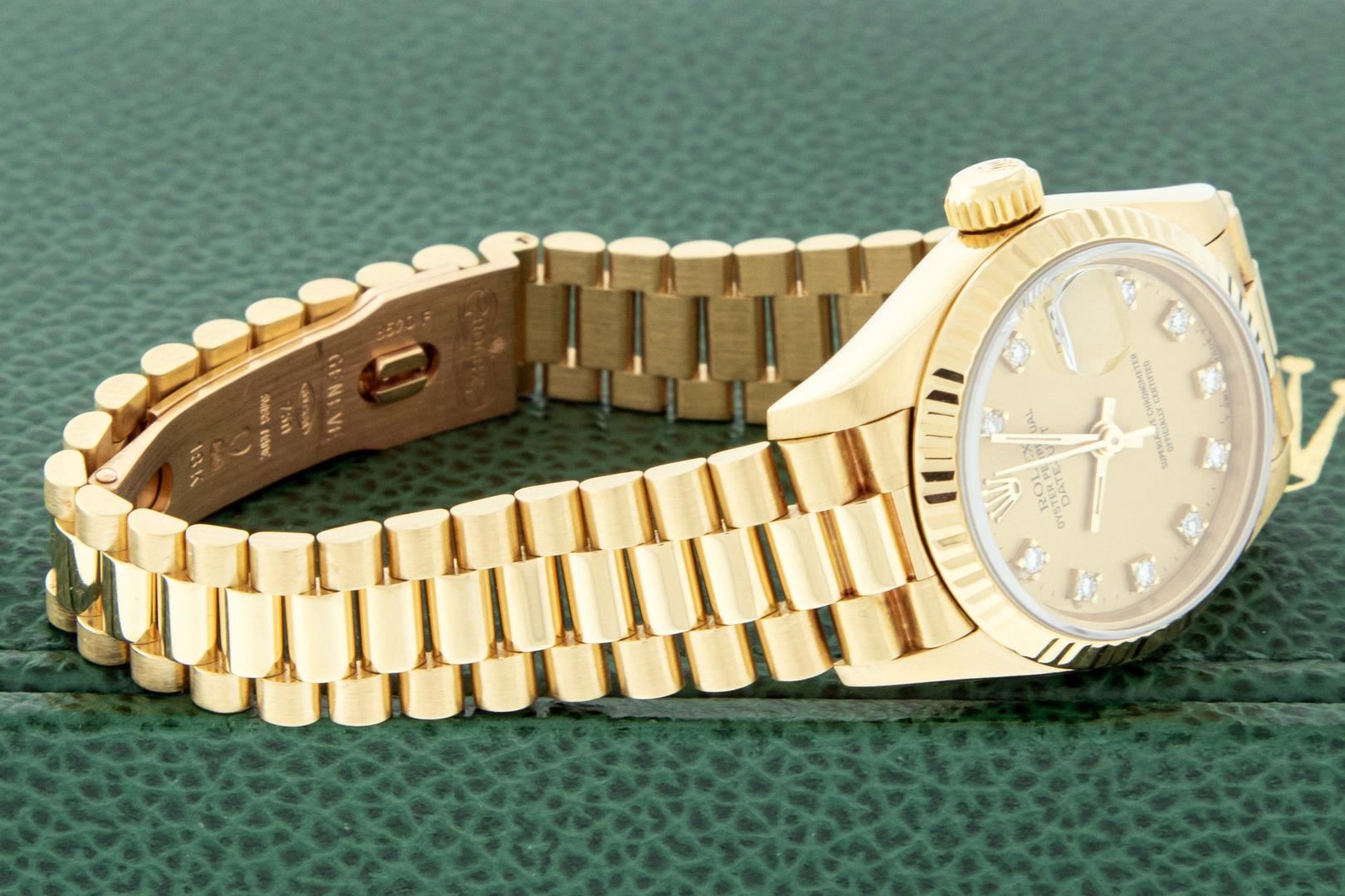 One Ladies Pre Owned Quickset Rolex 18K Yellow Gold President Polished, Serviced & Electronically Tested, Rolex 18K Yellow Gold Case: 26mm, Rolex 18K Yellow Gold Crown, Rolex Bezel: 18K Rolex Yellow Gold Fluted Bezel, Crystal: Sapphire With Cyclops Lens. Hands: Luminescent Hands. Rolex Movement: Automatic Winding Quickset Movement. Rolex Dial: Factory Rolex Champagne Diamond Dial, Diamond Count: 10 Diamonds In Dial, Clarity: VVS. Date Window: 3 O'Clock Position, Model: Datejust. Condition: G-6 Extra Fine, Rolex Bracelet: 18K Yellow Gold President Band, Bright & Satin Polish. 6.0 Inch Length, Standard President Clasp (Hidden Clasp), With Rolex Logo. This Watch Has Been Serviced Time Tested And Is In Excellent Condition It Is Free Of All Scratches And Dents. This Watch Comes With A Rolex Box.