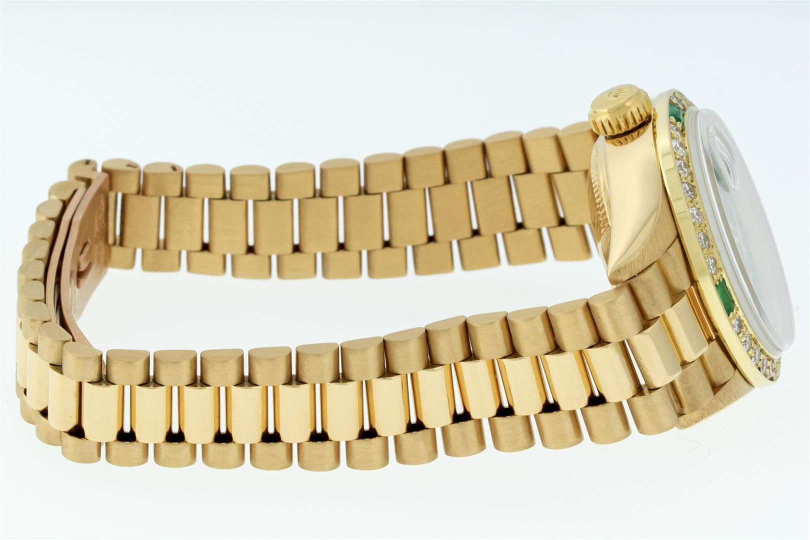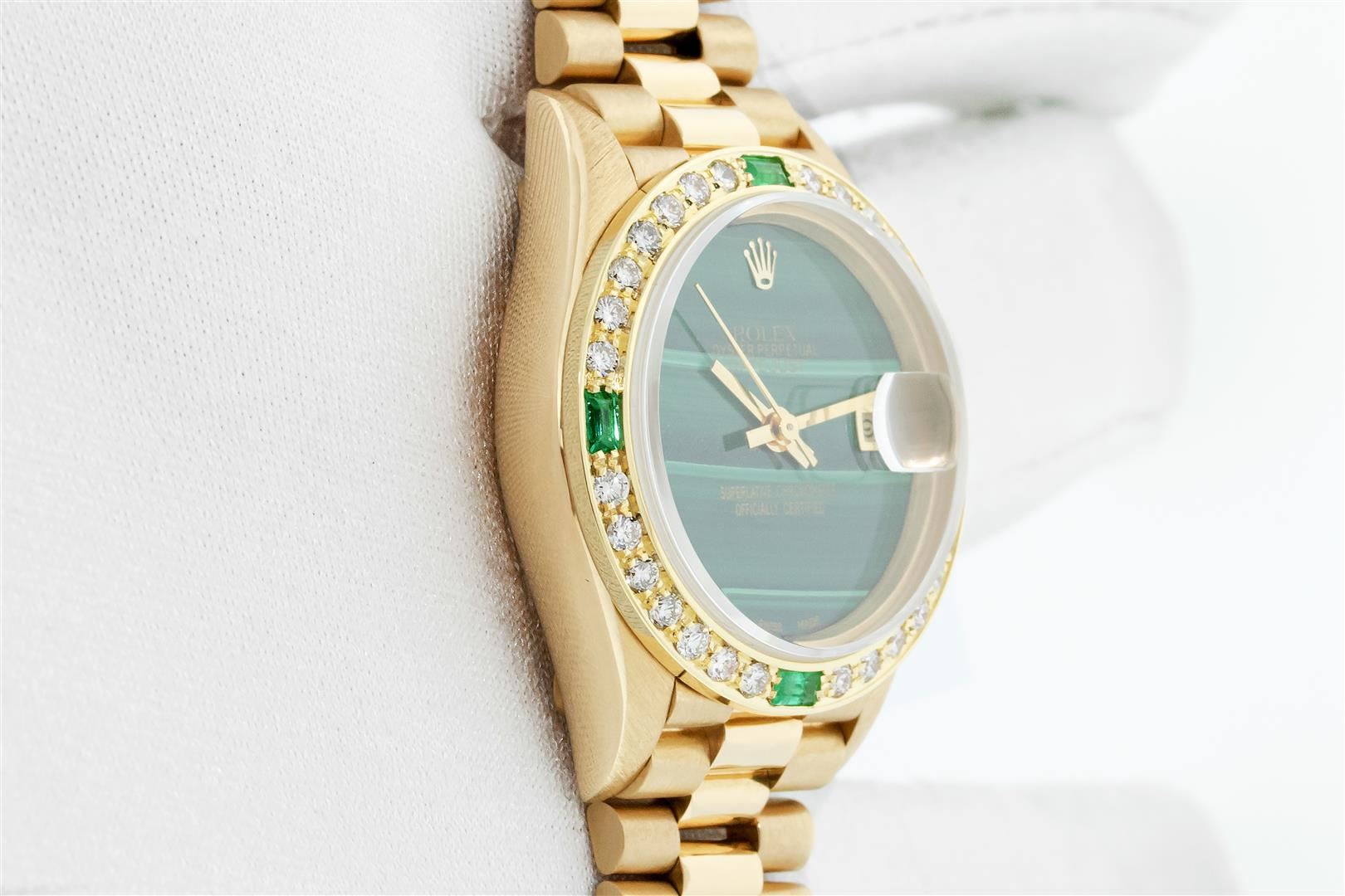One Ladies Rolex 18K Yellow Gold President Polished, Serviced & Electronically Tested, 18K Yellow Gold Case: 26mm, 18K Yellow Gold Crown, Custom Bezel: New 18K Yellow Gold Bead Set Diamond Bezel with Emeralds, Diamond Count: 36 Diamonds + 4 Emeralds, Clarity: SI-VS, Color: G to H. Custom Crystal: New Sapphire with Date Window. Custom Hands: New Luminescent Hands. Rolex Movement: Automatic Winding Movement. Custom Dial: Green Malachite Dial. Date Window: 3 O'Clock Position, Model: Datejust. Condition: G-6 Extra Fine This Preowned Watch Is In Very Good Condition Free Of All Scratches And Dents. Rolex Bracelet: 18K Yellow Gold President Band, Bright & Satin Polish. 6.0 Inch Length, Standard President Clasp (Hidden Clasp), with Rolex Logo. This Watch Has Been Serviced Time Tested And Is In Excellent Condition It Is Free Of All Scratches And Dents.