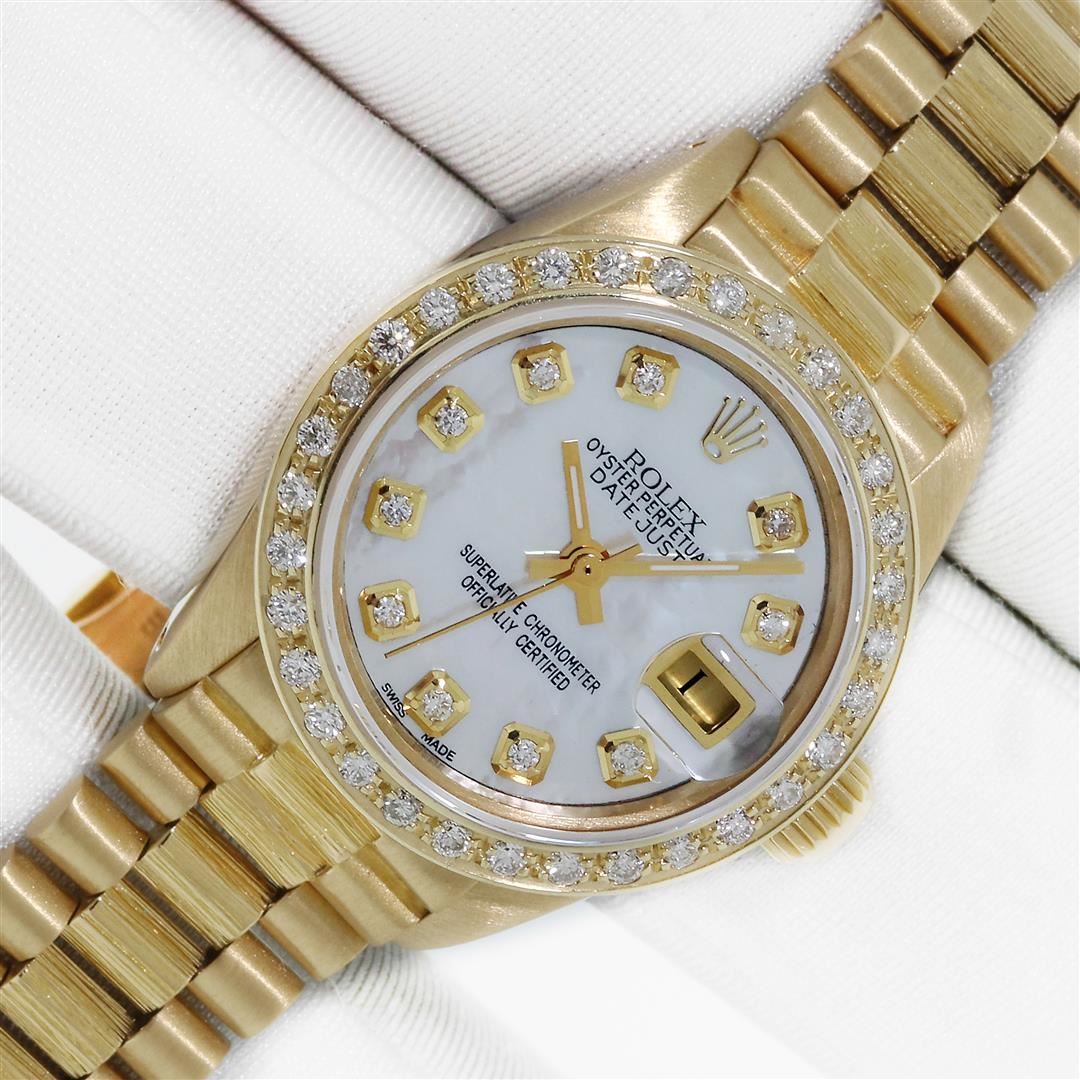 One Ladies Rolex 18K Yellow Gold President Polished, Serviced & Electronically Tested, Rolex 18K Yellow Gold Case: 26mm, Rolex 18K Yellow Gold Crown, Custom Bezel: New 18K Yellow Gold Bead Set Diamond Bezel, Diamond Count: 32 Diamonds, Clarity: SI-VS, Color: G to H. Custom Crystal: New Sapphire With Magnified Date Window. Rolex Movement: Automatic Winding Movement. Custom Dial: Mother Of Pearl With Diamond Dial, Color: G to H, Diamond Count: 10 Diamonds In Dial, Clarity: SI-VS. Date Window: 3 O'clock Position, Model: Datejust. Condition: G-6 Extra Fine The Watch Is In Very Good Condition Free Of All Scratches And Dents. Rolex Bracelet: 18K Yellow Gold President Band, Bright & Satin Polish. 6.0 Inch Length, Standard President Clasp (Hidden Clasp). This Pre Owned Watch Has Been Serviced And Polished It Is Free Of All Scratches And Dents.