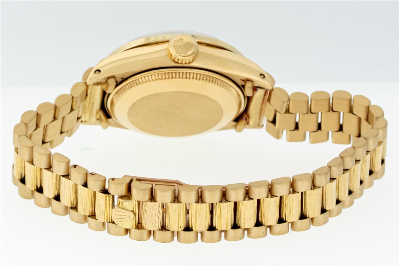 One Ladies Rolex 18K Yellow Gold President Polished, Serviced & Electronically Tested, Rolex 18K Yellow Gold Case: 26mm, Rolex 18K Yellow Gold Crown, Custom Bezel: New 18K Yellow Gold Bead Set Diamond Bezel, Diamond Count: 32 Diamonds, Clarity: SI-VS, Color: G to H. Custom Crystal: New Sapphire With Magnified Date Window. Rolex Movement: Automatic Winding Movement. Custom Dial: Mother Of Pearl With Diamond Dial, Color: G to H, Diamond Count: 10 Diamonds In Dial, Clarity: SI-VS. Date Window: 3 O'clock Position, Model: Datejust. Condition: G-6 Extra Fine The Watch Is In Very Good Condition Free Of All Scratches And Dents. Rolex Bracelet: 18K Yellow Gold President Band, Bright & Satin Polish. 6.0 Inch Length, Standard President Clasp (Hidden Clasp). This Pre Owned Watch Has Been Serviced And Polished It Is Free Of All Scratches And Dents.