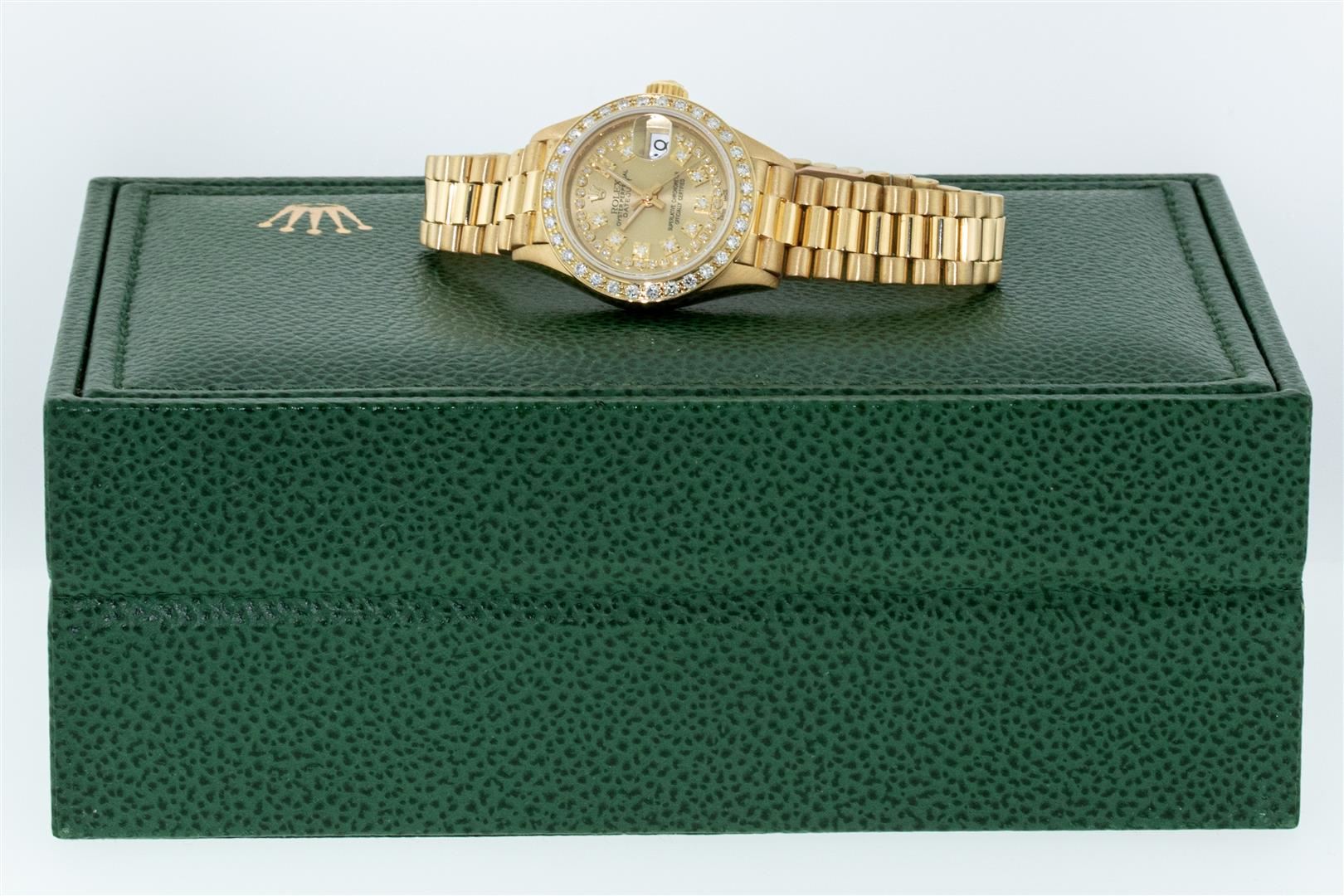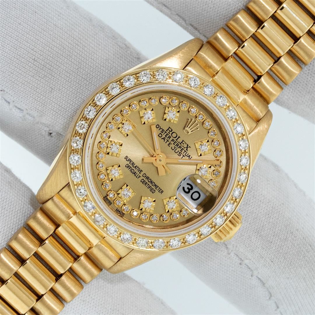 One Ladies Quickset Rolex 18K Yellow Gold President Polished, Serviced & Electronically Tested, Rolex 18K Yellow Gold Case: 26mm, Rolex 18K Yellow Gold Crown, Custom Bezel: New 18K Yellow Gold Bead Set Diamond Bezel, Diamond Count: 32 Diamonds On Bezel, Total Weight .70 Carat, Clarity: SI-VS, Color: G to H. Custom Crystal: New Sapphire With Magnified Date Window. Rolex Movement: Automatic Winding Quickset Movement. Custom Dial: Refinished To Champagne With Custom Added Diamonds, Color: G to H, Diamond Count: 43 Diamonds On Dial, Clarity: VS. Date Window: 3 O'clock Position, Model: Quickset Datejust President. Condition: G-6 Extra Fine The Watch Is In Very Good Condition Free Of All Scratches And Dents. Rolex Bracelet: 18K Yellow Gold President Band, Bright & Satin Polish. 6.0 Inch Length, Standard President Clasp (Hidden Clasp), With Rolex Logo. This Pre Owned Watch Has Been Serviced Time Tested And Is In Excellent Condition It Is Free Of All Scratches And Dents. This Watch Comes With A Rolex Box.