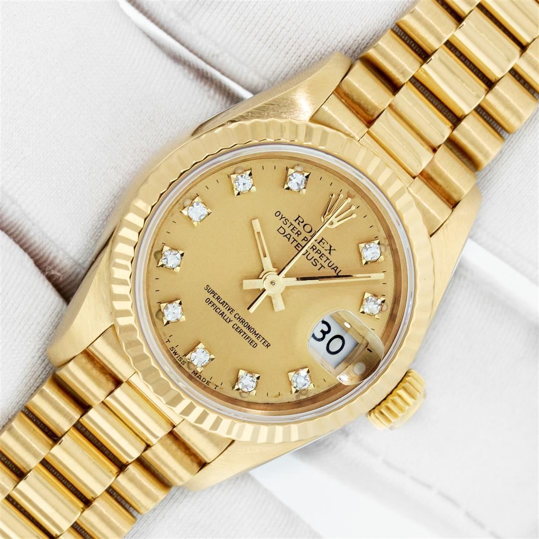 One Ladies Quickset Rolex 18K Yellow Gold President Polished, Serviced & Electronically Tested, Rolex 18K Yellow Gold Case: 26mm, Rolex 18K Yellow Gold Crown, Rolex Bezel: 18K Rolex Yellow Gold Fluted Bezel, Crystal: Sapphire With Cyclops Lens. Hands: Luminescent Hands. Rolex Movement: Automatic Winding Quickset Movement. Rolex Dial: Factory Rolex Champagne Diamond Dial, Diamond Count: 10 Diamonds In Dial, Clarity: VVS. Date Window: 3 O'clock Position, Model: Datejust. Condition: G-6 Extra Fine, Rolex Bracelet: 18K Yellow Gold President Band, Bright & Satin Polish. 6.0 Inch Length, Standard President Clasp (Hidden Clasp), With Rolex Logo. This Pre Owned Watch Has Been Serviced Time Tested And Is In Excellent Condition It Is Free Of All Scratches And Dents. This Watch Comes With A Rolex Box.