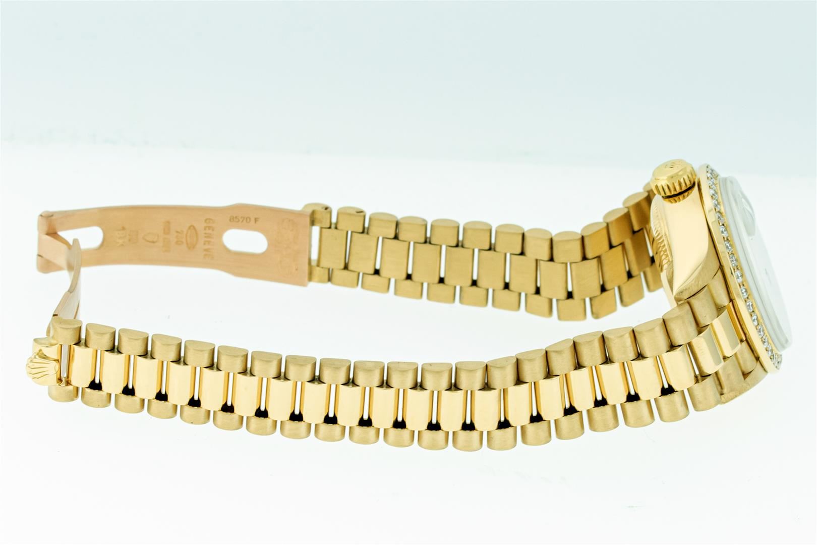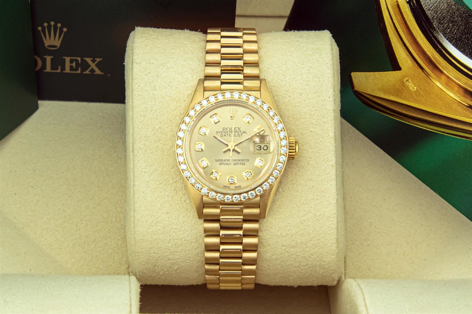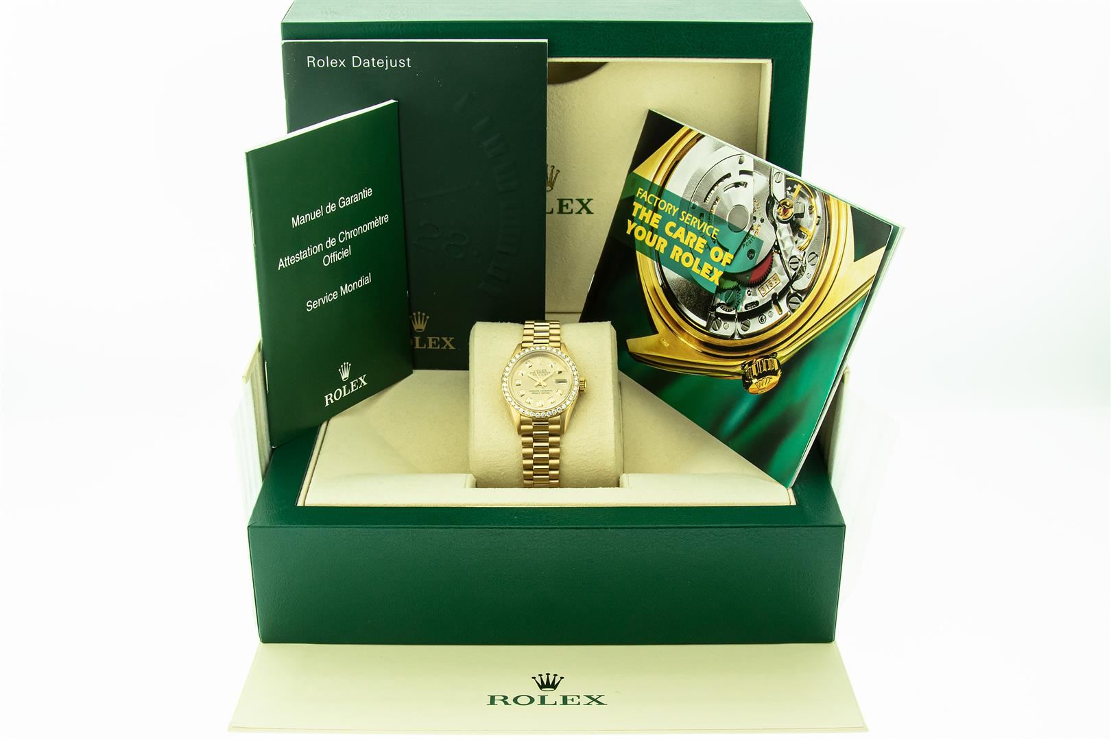 One Ladies Rolex 18K Yellow Gold President Polished, Serviced & Electronically Tested, 18K Yellow Gold Case: 26mm, Rolex 18K Yellow Gold Crown, Custom Bezel: 1.0ctw 18K Yellow Gold Bead Set Diamond Bezel, Diamond Count: 40 Diamonds Total Weight 1.0 Carat, Clarity: SI-VS, Color: G to H. Custom Crystal: New Sapphire With Magnified Date Window. Custom Hands: New Luminescent Hands. Rolex Movement: Automatic Winding Movement. Custom Dial: Refinished To Champagne With Custom Added Diamonds, Color: G to H, Diamond Count: 10 Diamonds In Dial, Clarity: SI-VS. Date Window: 3 O'clock Position, Model: Datejust. Condition: G-6 Extra Fine The Watch Is In Very Good Condition Free Of All Scratches And Dents. Rolex Bracelet: 18K Yellow Gold President Band, Bright & Satin Polish. 6.0 Inch Length, Standard President Clasp (Hidden Clasp), With Rolex Logo. This Pre Owned Watch Has Been Serviced Time Tested And Is In Excellent Condition It Is Free Of All Scratches And Dents. This Watch Comes With A Rolex Box And Booklets.