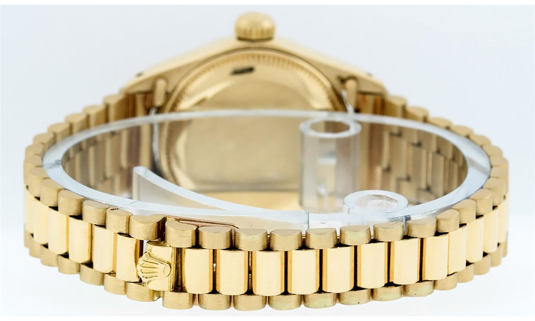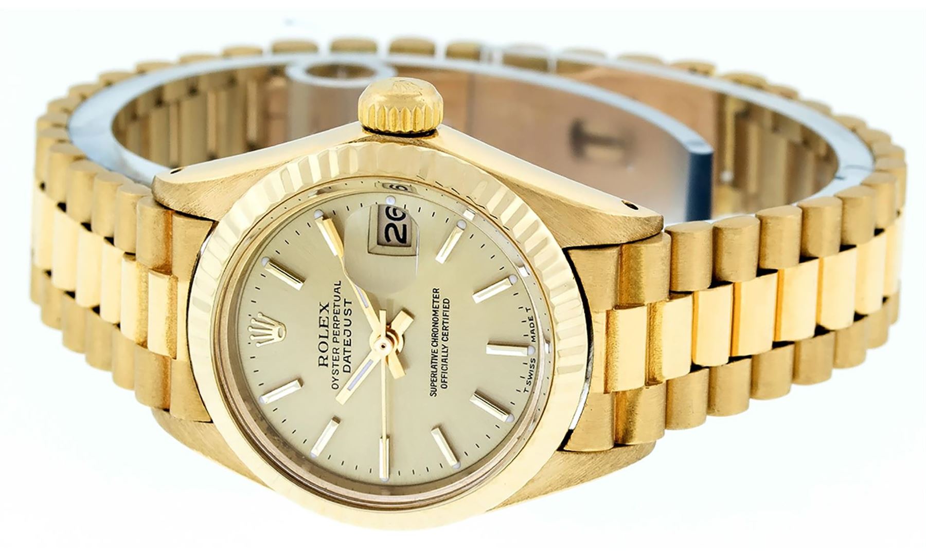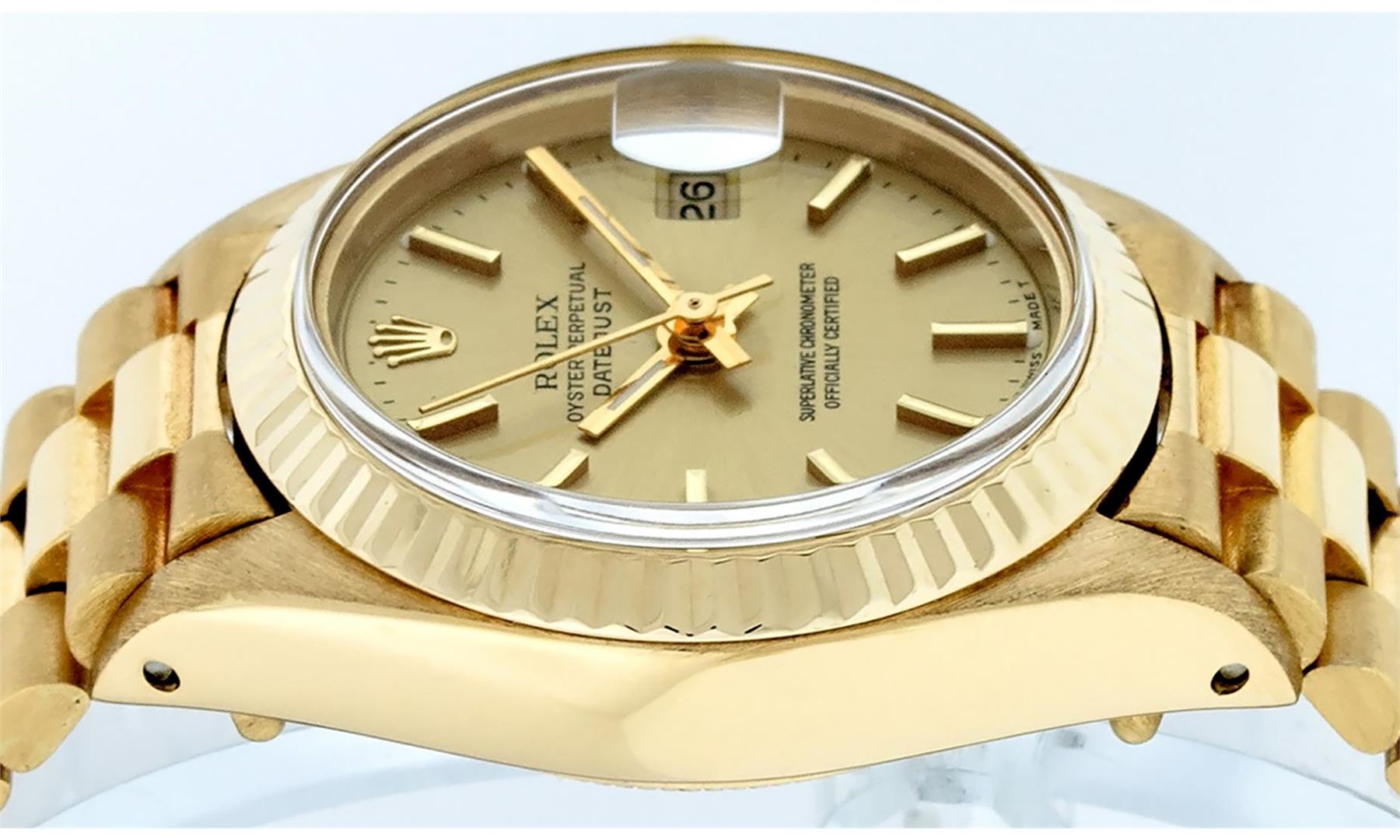 One Ladies Pre Owned Rolex 18K Yellow Gold President Polished, Serviced & Electronically Tested, Rolex 18K Yellow Gold Case: 26mm, Rolex 18K Yellow Gold Crown, Rolex Bezel: 18K Yellow Gold Fluted Bezel. Custom Crystal: New Acrylic Cyclops Lens. Custom Hands: New Luminescent Hands. Rolex Movement: Automatic Winding Movement. Rolex Dial: Champagne Index Dial. Date Window: 3 O'Clock Position, Model: Datejust President. Condition: G-6 Extra Fine The Watch Is In Very Good Condition Free Of All Scratches And Dents. Rolex Bracelet: 18K Yellow Gold President Band, Bright & Satin Polish. 6.0 Inch Length, Standard President Clasp (Hidden Clasp), With Rolex Logo.