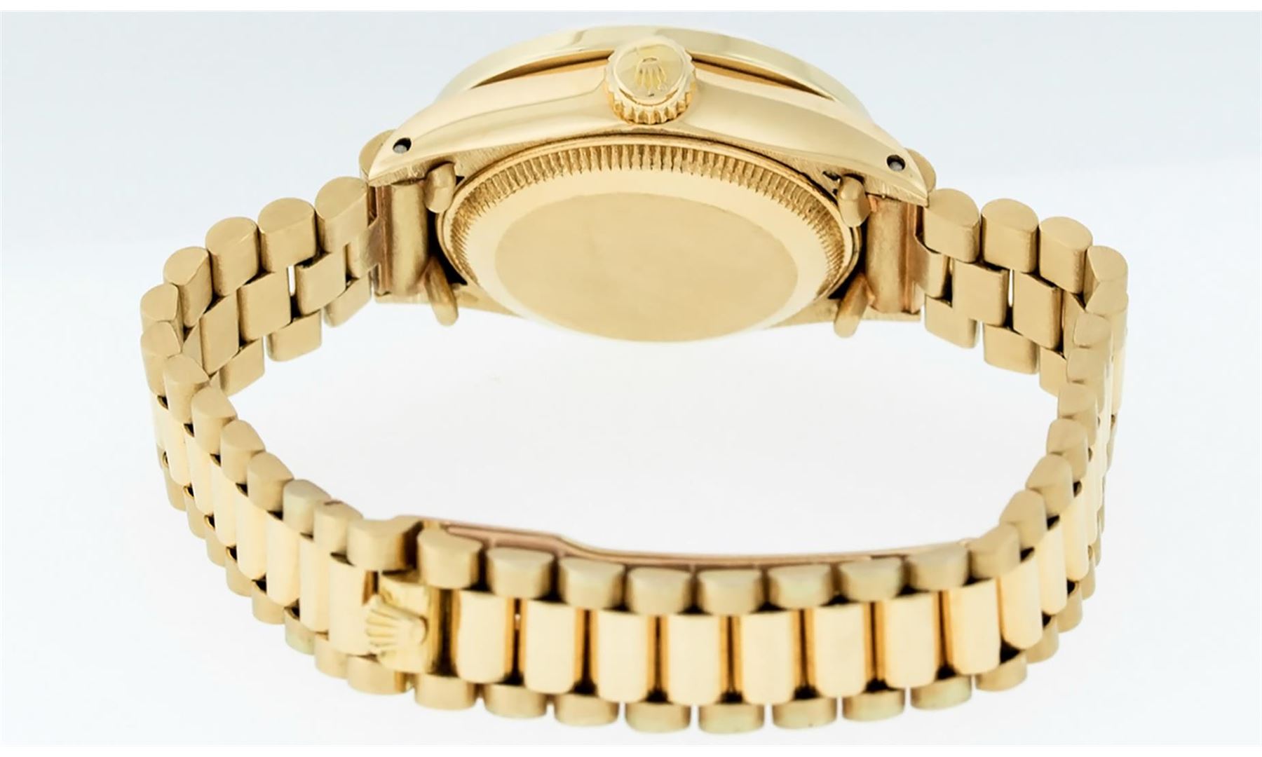 One Ladies 18K Yellow Gold Pre Owned Rolex Presidential Polished, Serviced & Electronically Tested, Rolex 18K Yellow Gold Case: 26mm, Rolex 18K Yellow Gold Crown, Custom Bezel: New 18K Yellow Gold Sapphire Channel Set Diamond Bezel, Diamond + Stone Count: 36 Diamonds + 4 Sapphires. Total Weight 1.00 Carat, Clarity: SI-VS, Color: G to H. Custom Crystal: New Scratch Resistant Synthetic Sapphire Cyclops Lens. Custom Hands: New Luminescent Hands. Rolex Movement: Automatic Winding Movement. Rolex Dial: Champagne Index With Dash Track & Lumi Dots. Date Window: 3 O'Clock Position, Model: Datejust Presidential, Condition: G-6 Extra Fine. Rolex Bracelet: 18K Yellow Gold President With Hidden Clasp, Bright & Satin Polish. 6.0 Inch Length, Standard President Clasp (Hidden Clasp), With Rolex Logo. Watch Has Been Serviced And Polished It Is Free Of All Scratches And Dents. This Watch Has Been Serviced Time Tested And Is In Excellent Condition It Is Free Of All Scratches And Dents.